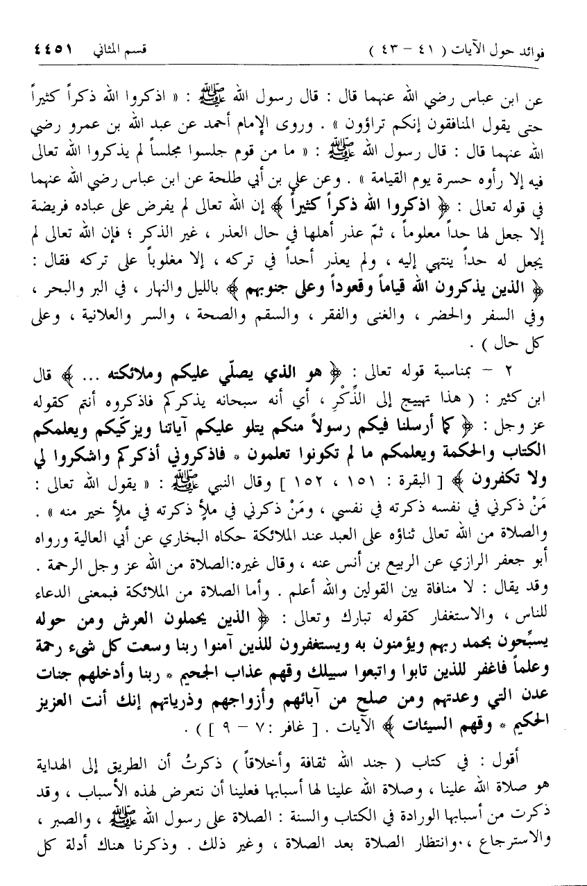 بمناسبة قوله تعالى: هُوَ الَّذِي يُصَلِّي عَلَيْكُمْ وَمَلائِكَتُهُ ... قال ابن كثير: (هذا تهييج إلى الذّكر، أي أنه سبحانه يذكركم فاذكروه أنتم كقوله عزّ وجل: كَما أَرْسَلْنا فِيكُمْ رَسُولًا مِنْكُمْ يَتْلُوا عَلَيْكُمْ آياتِنا وَيُزَكِّيكُمْ وَيُعَلِّمُكُمُ الْكِتابَ وَالْحِكْمَةَ وَيُعَلِّمُكُمْ ما لَمْ تَكُونُوا تَعْلَمُونَ* فَاذْكُرُونِي أَذْكُرْكُمْ وَاشْكُرُوا لِي وَلا تَكْفُرُونِ [البقرة: 151، 152] وقال النبي صلّى الله عليه وسلم: «يقول الله تعالى: