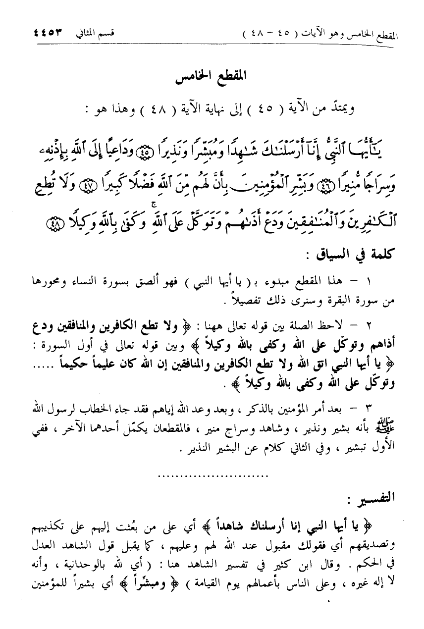 3 - بعد أمر المؤمنين بالذكر، وبعد وعد الله إياهم فقد جاء الخطاب لرسول الله صلّى الله عليه وسلم بأنه بشير ونذير، وشاهد وسراج منير، فالمقطعان يكمّل أحدهما الآخر، ففي الأول تبشير، وفي الثاني كلام عن البشير النذير.