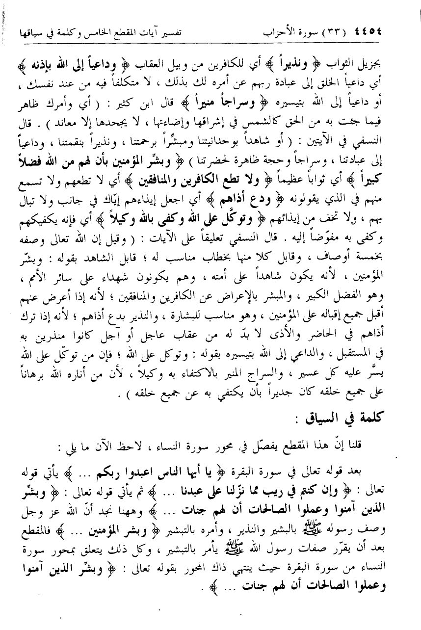 وَلا تُطِعِ الْكافِرِينَ وَالْمُنافِقِينَ أي لا تطعهم ولا تسمع منهم في الذي يقولونه وَدَعْ أَذاهُمْ أي اجعل إيذاءهم إيّاك في جانب ولا تبال بهم، ولا تخف من إيذائهم وَتَوَكَّلْ عَلَى اللَّهِ وَكَفى بِاللَّهِ وَكِيلًا أي فإنه يكفيكهم وكفى به مفوّضا إليه. قال النسفي تعليقا على الآيات: (وقيل إن الله تعالى وصفه بخمسة أوصاف، وقابل كلا منها بخطاب مناسب له؛ قابل الشاهد بقوله: وبشّر المؤمنين، لأنه يكون شاهدا على أمته، وهم يكونون شهداء على سائر الأمم، وهو الفضل الكبير، والمبشر بالإعراض عن الكافرين والمنافقين؛ لأنه إذا أعرض عنهم أقبل جميع إقباله على المؤمنين، وهو مناسب للبشارة، والنذير بدع أذاهم؛ لأنه إذا ترك أذاهم في الحاضر والأذى لا بدّ له من عقاب عاجل أو آجل كانوا منذرين به في المستقبل، والداعي إلى الله بتيسيره بقوله: وتوكل على الله؛ فإن من توكّل على الله يسّر عليه كل عسير، والسراج المنير بالاكتفاء به وكيلا، لأن من أناره الله برهانا على جميع خلقه كان جديرا بأن يكتفي به عن جميع خلقه).
