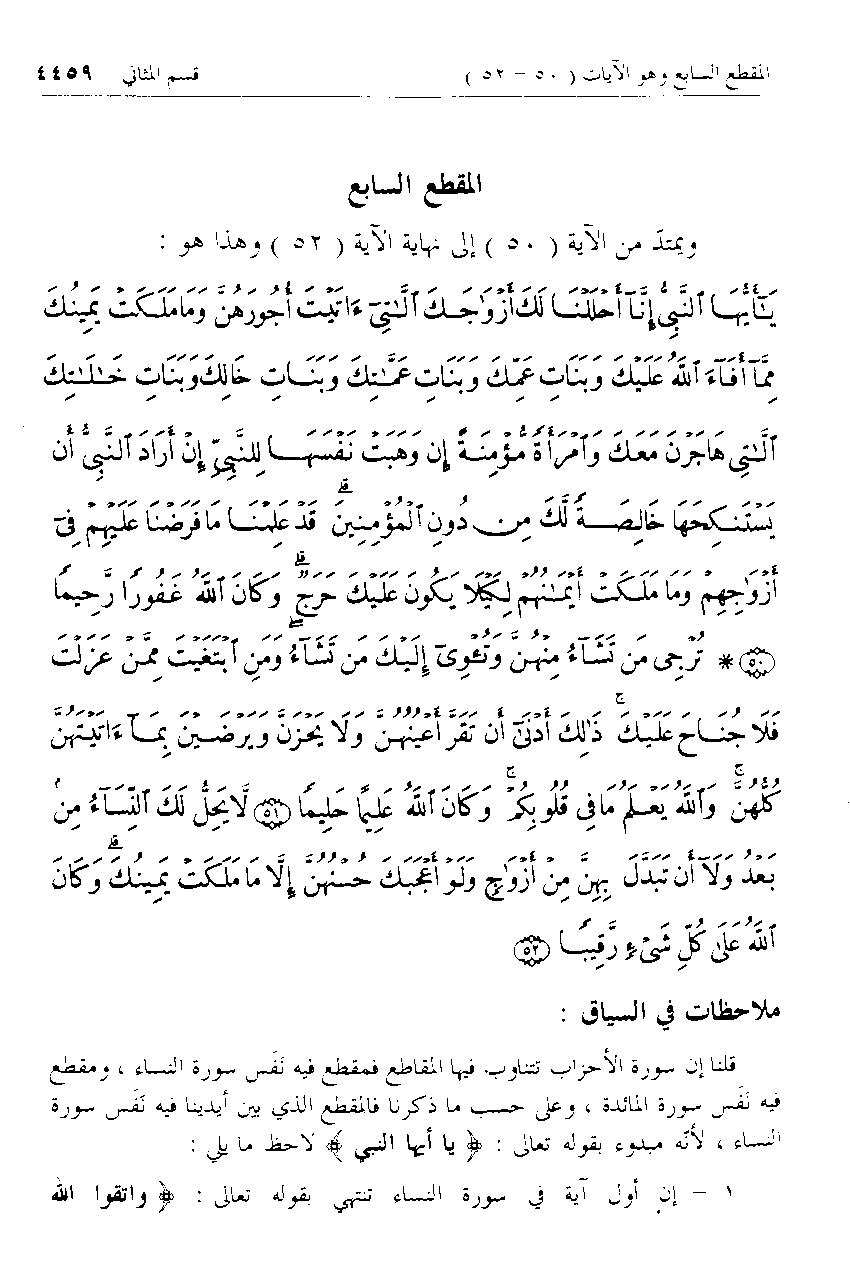 قلنا إن سورة الأحزاب تتناوب فيها المقاطع فمقطع فيه نفس سورة النساء، ومقطع فيه نفس سورة المائدة، وعلى حسب ما ذكرنا فالمقطع الذي بين أيدينا فيه نفس سورة النساء، لأنّه مبدوء بقوله تعالى: يا أَيُّهَا النَّبِيُّ لاحظ ما يلي: