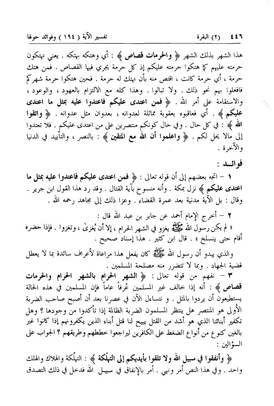 3 - نفهم من قوله تعالى: الشَّهْرُ الْحَرامُ بِالشَّهْرِ الْحَرامِ وَالْحُرُماتُ قِصاصٌ: أنه إذا خالف غير المسلمين عرفا عاما فإن المسلمين في هذه الحالة يستطيعون أن يردوا بالمثل. ونتساءل الآن في عصرنا بعد أن أصبح صاحب الضربة الأولى هو المنتصر هل ينتظر المسلمون الضربة الظالمة إذا تأكدوا من وجودها؟ وهل تكفير أبنائنا الذي هو أشد من القتل يبيح لنا قتل أبناء الذين يكفرونهم إذا كانوا غير بالغين كنوع من أنواع الضغط على الكافرين ليراجعوا خططهم وطريقهم؟ الجواب على السؤالين: