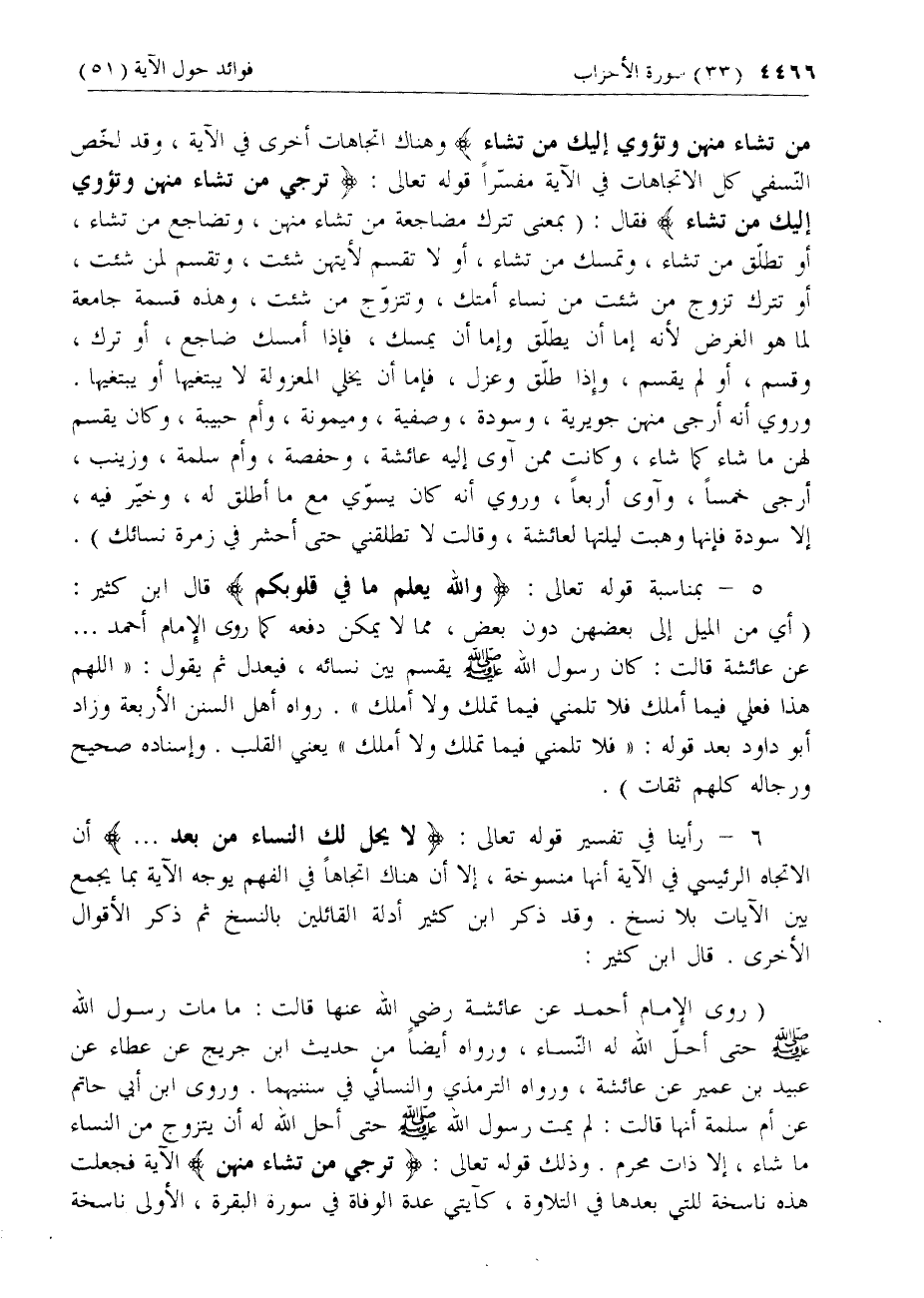مَنْ تَشاءُ مِنْهُنَّ وَتُؤْوِي إِلَيْكَ مَنْ تَشاءُ وهناك اتجاهات أخرى في الآية، وقد لخّص النّسفي كل الاتجاهات في الآية مفسّرا قوله تعالى: تُرْجِي مَنْ تَشاءُ مِنْهُنَّ وَتُؤْوِي إِلَيْكَ مَنْ تَشاءُ فقال: (بمعنى تترك مضاجعة من تشاء منهن، وتضاجع من تشاء، أو تطلّق من تشاء، وتمسك من تشاء، أو لا تقسم لأيتهن شئت، وتقسم لمن شئت، أو تترك تزوج من شئت من نساء أمتك، وتتزوّج من شئت، وهذه قسمة جامعة لما هو الغرض لأنه إما أن يطلّق وإما أن يمسك، فإذا أمسك ضاجع، أو ترك، وقسم، أو لم يقسم، وإذا طلّق وعزل، فإما أن يخلي المعزولة لا يبتغيها أو يبتغيها.