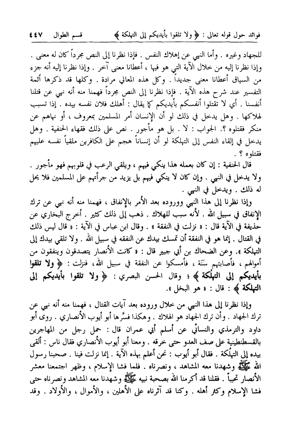 وإذا نظرنا إلى هذا النهي من خلال وروده بعد آيات القتال، فهمنا منه أنه نهي عن ترك الجهاد. وأن ترك الجهاد هو الهلاك. وهكذا فسرها أبو أيوب الأنصاري. روى أبو داود والترمذي والنسائي عن أسلم أبي عمران قال: حمل رجل من المهاجرين بالقسطنطينية على صف العدو حتى خرقه. ومعنا أبو أيوب الأنصاري فقال ناس: ألقى بيده إلى التهلكة. فقال أبو أيوب: نحن أعلم بهذه الآية. إنما نزلت فينا. صحبنا رسول الله صلى الله عليه وسلم وشهدنا معه المشاهد، ونصرناه. فلما فشا الإسلام، وظهر اجتمعنا معشر الأنصار تحببا. فقلنا قد أكرمنا الله بصحبة نبيه صلى الله عليه وسلم وشهدنا معه المشاهد ونصرناه حتى فشا الإسلام وكثر أهله. وكنا قد آثرناه على الأهلين، والأموال، والأولاد. وقد