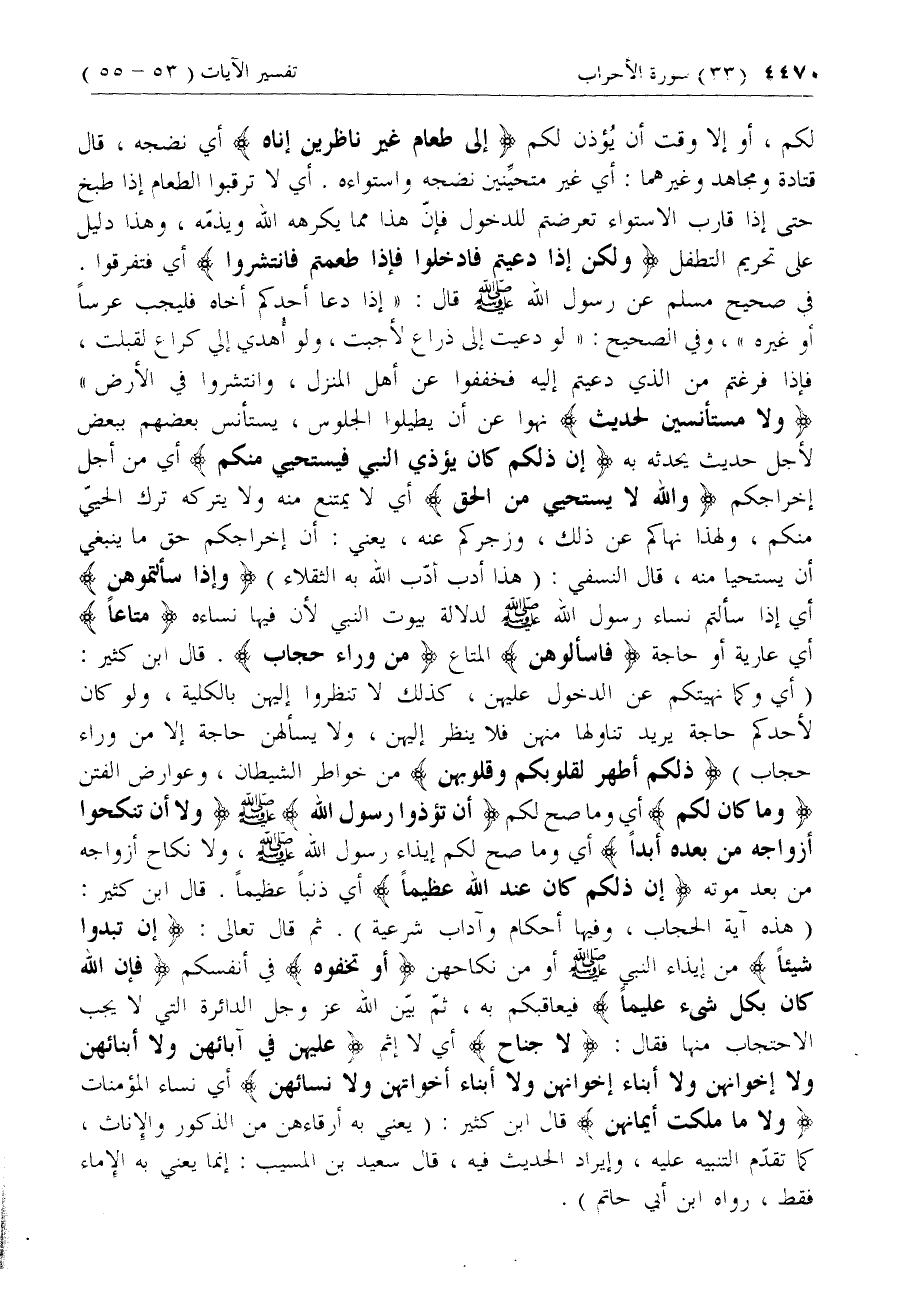 في صحيح مسلم عن رسول الله صلّى الله عليه وسلم قال: «إذا دعا أحدكم أخاه فليجب عرسا أو غيره»، وفي الصحيح: «لو دعيت إلى ذراع لأجبت، ولو أهدي إلى كراع لقبلت، فإذا فرغتم من الذي دعيتم إليه فخففوا عن أهل المنزل، وانتشروا في الأرض» وَلا مُسْتَأْنِسِينَ لِحَدِيثٍ نهوا عن أن يطيلوا الجلوس، يستأنس بعضهم ببعض لأجل حديث يحدثه به إِنَّ ذلِكُمْ كانَ يُؤْذِي النَّبِيَّ فَيَسْتَحْيِي مِنْكُمْ أي من أجل إخراجكم وَاللَّهُ لا يَسْتَحْيِي مِنَ الْحَقِّ أي لا يمتنع منه ولا يتركه ترك الحييّ منكم، ولهذا نهاكم عن ذلك، وزجركم عنه، يعني: أن إخراجكم حق ما ينبغي أن يستحيا منه، قال النسفي: (هذا أدب أدّب الله به الثقلاء) وَإِذا سَأَلْتُمُوهُنَّ أي إذا سألتم نساء رسول الله صلّى الله عليه وسلم لدلالة بيوت النبي لأن فيها نساءه مَتاعاً أي عارية أو حاجة فَسْئَلُوهُنَّ المتاع مِنْ وَراءِ حِجابٍ. قال ابن كثير: