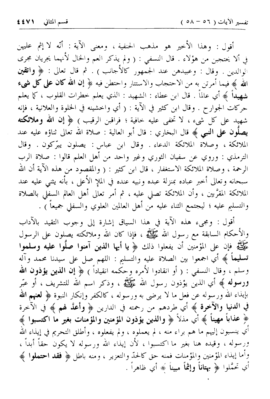 إِنَّ اللَّهَ وَمَلائِكَتَهُ يُصَلُّونَ عَلَى النَّبِيِّ قال البخاري: قال أبو العالية: صلاة الله تعالى ثناؤه عليه عند الملائكة، وصلاة الملائكة الدعاء. وقال ابن عباس: يصلون يبرّكون. وقال الترمذي: وروي عن سفيان الثوري وغير واحد من أهل العلم قالوا: صلاة الرب الرحمة، وصلاة الملائكة الاستغفار، قال ابن كثير: (والمقصود من هذه الآية أن الله سبحانه وتعالى أخبر عباده بمنزلة عبده ونبيه عنده في الملإ الأعلى، بأنه يثني عليه عند الملائكة المقرّبين، وأن الملائكة تصلي عليه، ثم أمر تعالى أهل العالم السفلي بالصلاة والتسليم عليه؛ ليجتمع الثناء عليه من أهل العالمين العلوي والسفلي جميعا).
