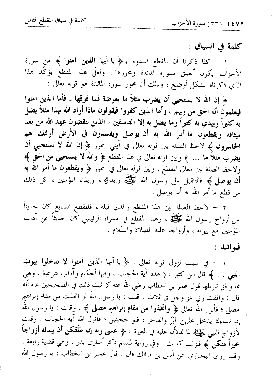 2 - لاحظ الصلة بين هذا المقطع والذي قبله، فالمقطع السابع كان حديثا عن أزواج رسول الله صلّى الله عليه وسلم، وهذا المقطع في مسراه الرئيسي كان حديثا عن آداب المؤمنين مع بيوته، وأزواجه عليه الصلاة والسّلام.