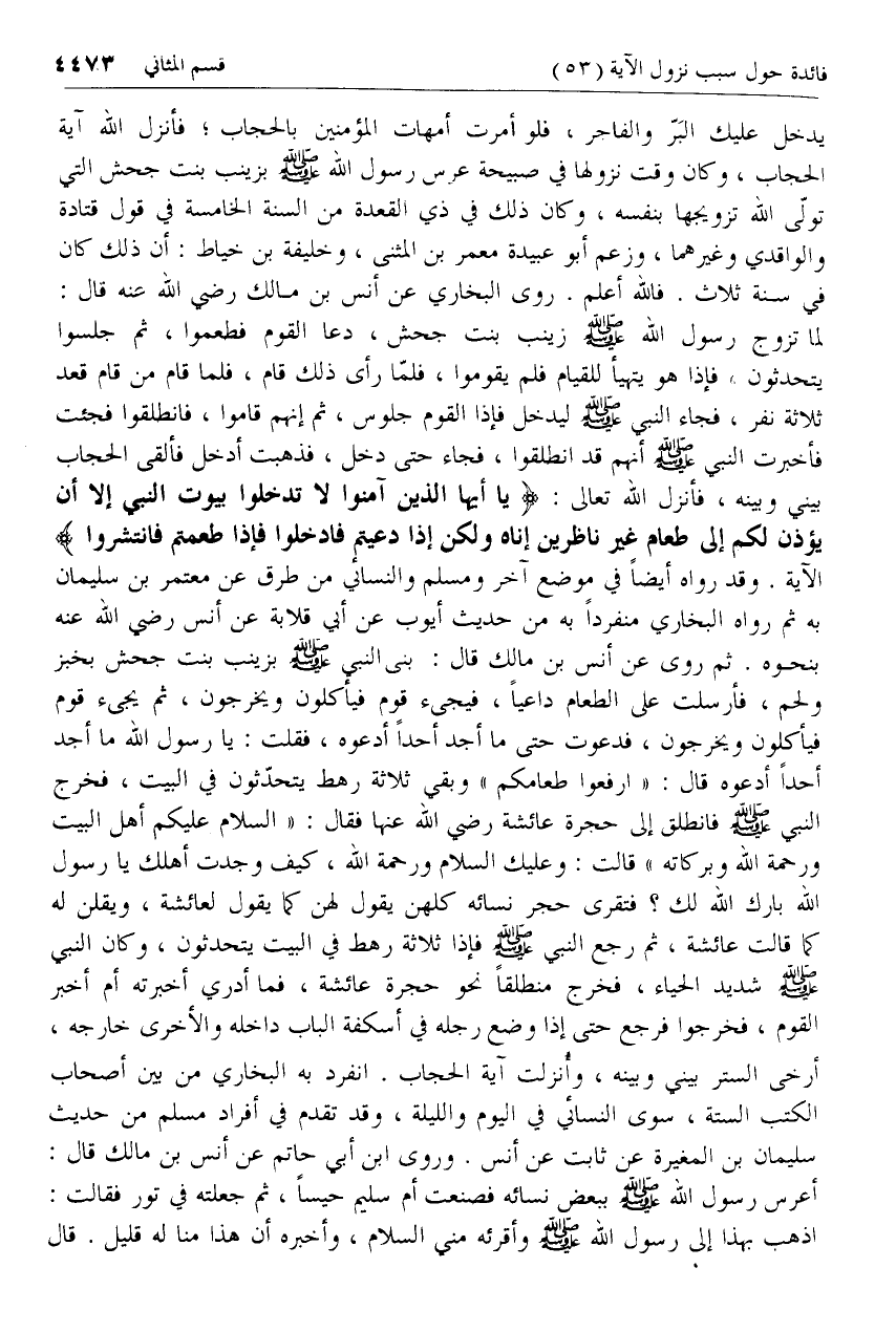 دخل، فذهبت أدخل فألقى الحجاب بيني وبينه، فأنزل الله تعالى: يا أَيُّهَا الَّذِينَ آمَنُوا لا تَدْخُلُوا بُيُوتَ النَّبِيِّ إِلَّا أَنْ يُؤْذَنَ لَكُمْ إِلى طَعامٍ غَيْرَ ناظِرِينَ إِناهُ وَلكِنْ إِذا دُعِيتُمْ فَادْخُلُوا فَإِذا طَعِمْتُمْ فَانْتَشِرُوا الآية. وقد رواه أيضا في موضع آخر ومسلم والنسائي من طرق عن معتمر بن سليمان به ثم رواه البخاري منفردا به من حديث أيوب عن أبي قلابة عن أنس رضي الله عنه بنحوه. ثم روى عن أنس بن مالك قال: بنى النبي صلّى الله عليه وسلم بزينب بنت جحش بخبز ولحم، فأرسلت على الطعام داعيا، فيجئ قوم فيأكلون ويخرجون، ثم يجئ قوم فيأكلون ويخرجون، فدعوت حتى ما أجد أحدا أدعوه، فقلت: يا رسول الله ما أجد أحدا أدعوه قال: «ارفعوا طعامكم» وبقي ثلاثة رهط يتحدّثون في البيت، فخرج النبي صلّى الله عليه وسلم فانطلق إلى حجرة عائشة رضي الله عنها فقال: «السلام عليكم أهل البيت ورحمة الله وبركاته» قالت: وعليك السلام ورحمة الله، كيف وجدت أهلك يا رسول الله بارك الله لك؟ فتقرى حجر نسائه كلهن يقول لهن كما يقول لعائشة، ويقلن له كما قالت عائشة، ثم رجع النبي صلّى الله عليه وسلم فإذا ثلاثة رهط في البيت يتحدثون، وكان النبي صلّى الله عليه وسلم شديد الحياء، فخرج منطلقا نحو حجرة عائشة، فما أدري أخبرته أم أخبر القوم، فخرجوا فرجع حتى إذا وضع رجله في أسكفة الباب داخله والأخرى خارجه، أرخى الستر بيني وبينه، وأنزلت آية الحجاب. انفرد به البخاري من بين أصحاب الكتب الستة، سوى النسائي في اليوم والليلة، وقد تقدم في أفراد مسلم من حديث سليمان بن المغيرة عن ثابت عن أنس. وروى ابن أبي حاتم عن أنس بن مالك قال: