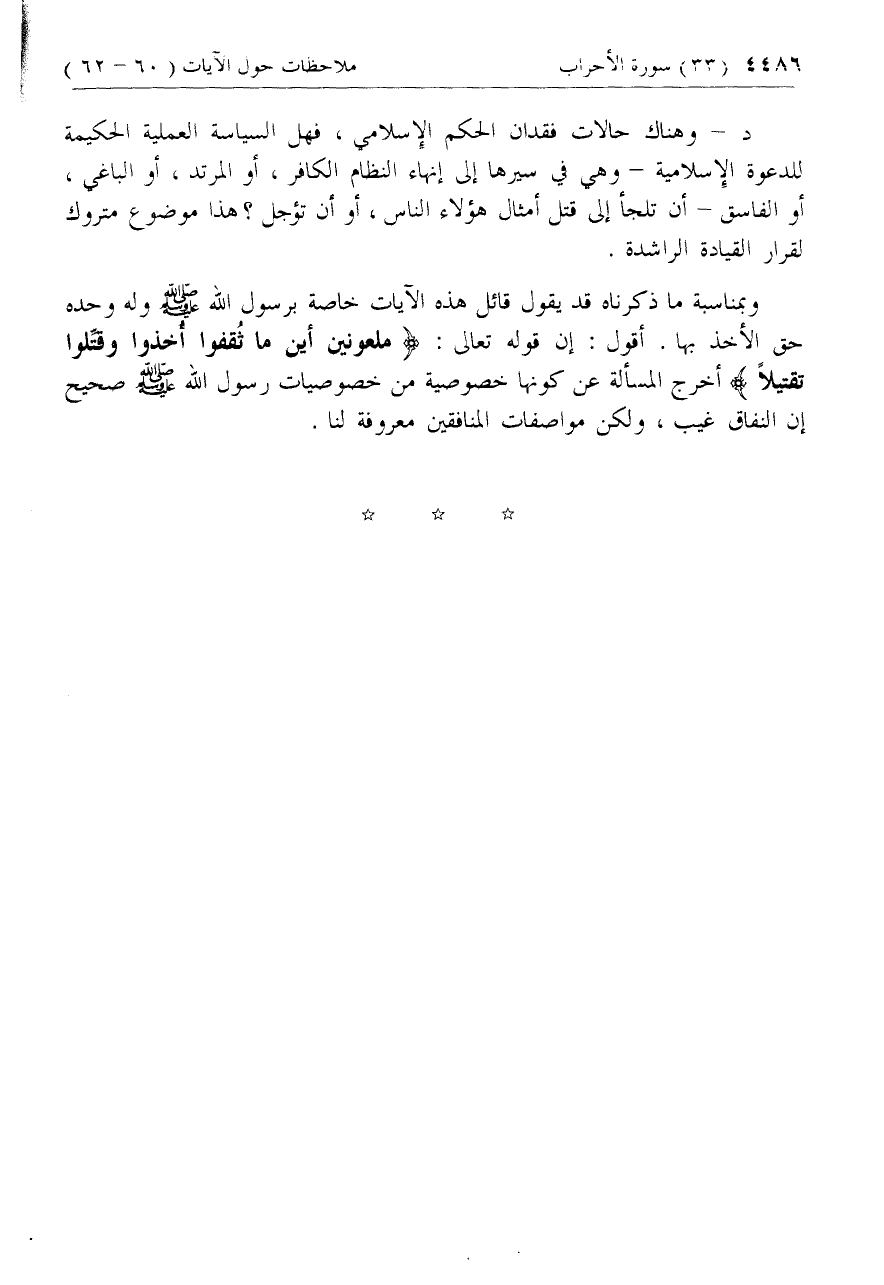 وبمناسبة ما ذكرناه قد يقول قائل هذه الآيات خاصة برسول الله صلّى الله عليه وسلم وله وحده حق الأخذ بها. أقول: إن قوله تعالى: مَلْعُونِينَ أَيْنَما ثُقِفُوا أُخِذُوا وَقُتِّلُوا تَقْتِيلًا أخرج المسألة عن كونها خصوصية من خصوصيات رسول الله صلّى الله عليه وسلم صحيح إن النفاق غيب، ولكن مواصفات المنافقين معروفة لنا.