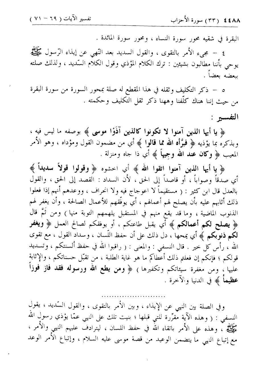 وفي الصلة بين النهي عن الإيذاء، وبين الأمر بالتقوى، والقول السّديد، يقول النسفي: (وهذه الآية مقرّرة للتي قبلها؛ بنيت تلك على النهي عمّا يؤذي رسول الله صلّى الله عليه وسلم، وهذه على الأمر باتقاء الله في حفظ اللسان، ليترادف عليهم النهي والأمر، مع اتباع النهي ما يتضمن الوعيد من قصة موسى عليه السلام، واتباع الأمر الوعد