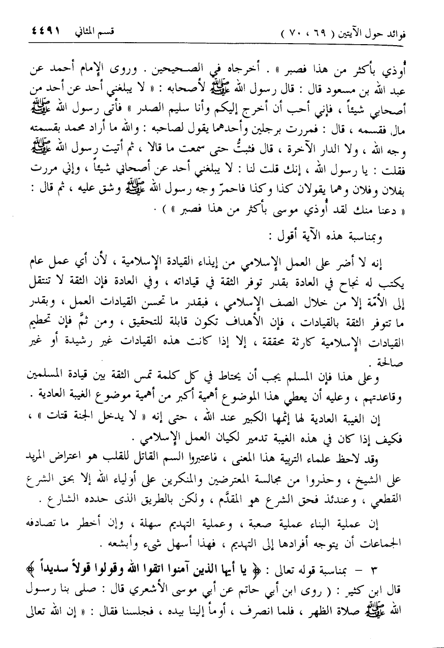 بمناسبة قوله تعالى: يا أَيُّهَا الَّذِينَ آمَنُوا اتَّقُوا اللَّهَ وَقُولُوا قَوْلًا سَدِيداً قال ابن كثير: (روى ابن أبي حاتم عن أبي موسى الأشعري قال: صلى بنا رسول الله صلّى الله عليه وسلم صلاة الظهر، فلما انصرف، أومأ إلينا بيده، فجلسنا فقال: «إن الله تعالى