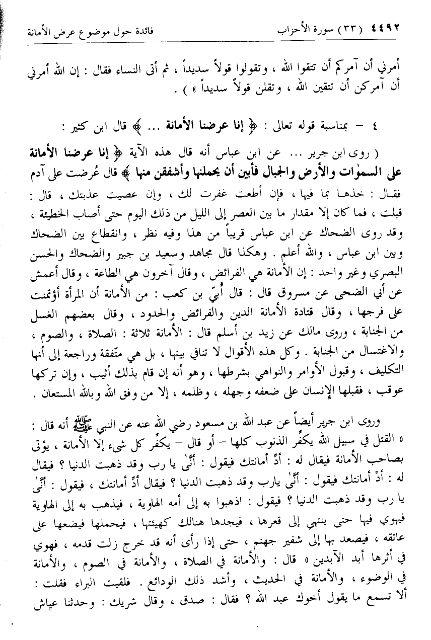 4 - [كلام ابن كثير بمناسبة قوله تعالى إِنَّا عَرَضْنَا الْأَمانَةَ .. ]
