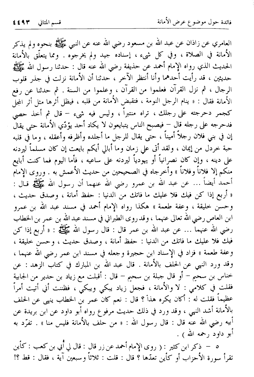 «أربع إذا كن فيك فلا عليك ما فاتك من الدنيا: حفظ أمانة، وصدق حديث، وحسن خليقة، وعفة طعمة» هكذا رواه الإمام أحمد في مسند عبد الله بن عمرو ابن العاص رضي الله تعالى عنهما، وقد روى الطبراني في مسند عبد الله بن عمر بن الخطاب رضي الله عنهما ... عن عبد الله بن عمر قال: قال رسول الله صلّى الله عليه وسلم: «أربع إذا كن فيك فلا عليك ما فاتك من الدنيا: حفظ أمانة، وصدق حديث، وحسن خليقة، وعفة طعمة» فزاد في الإسناد ابن حجيرة وجعله في مسند ابن عمر رضي الله عنهما، وقد ورد النهي عن الحلف بالأمانة. قال عبد الله بن المبارك في كتاب الزهد: عن خناس بن سحيم- أو قال جبلة بن سحيم- قال: أقبلت مع زياد بن حدير من الجابية فقلت في كلامي: لا والأمانة، فجعل زياد يبكي ويبكي، فظننت أني أتيت أمرا عظيما فقلت له: أكان يكره هذا؟ قال: نعم كان عمر بن الخطاب ينهى عن الحلف بالأمانة أشد النهي، وقد ورد في ذلك حديث مرفوع رواه أبو داود عن ابن بريدة عن أبيه رضي الله عنه قال: قال رسول الله: «من حلف بالأمانة فليس منا». تفرّد به أبو داود رحمه الله).
