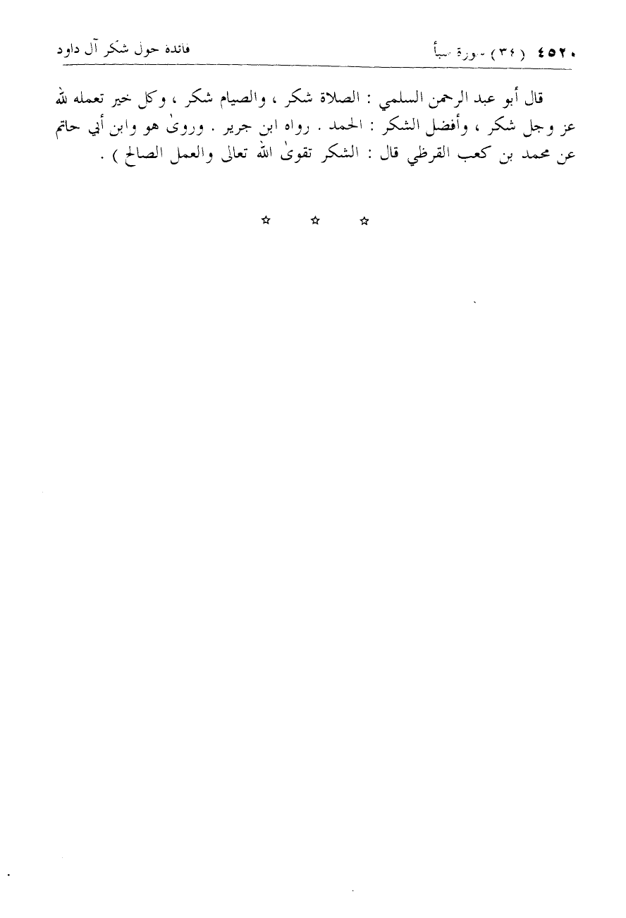 قال أبو عبد الرحمن السلمي: الصلاة شكر، والصيام شكر، وكل خير تعمله لله عزّ وجل شكر، وأفضل الشكر: الحمد. رواه ابن جرير. وروى هو وابن أبي حاتم عن محمد بن كعب القرظي قال: الشكر تقوى الله تعالى والعمل الصالح).