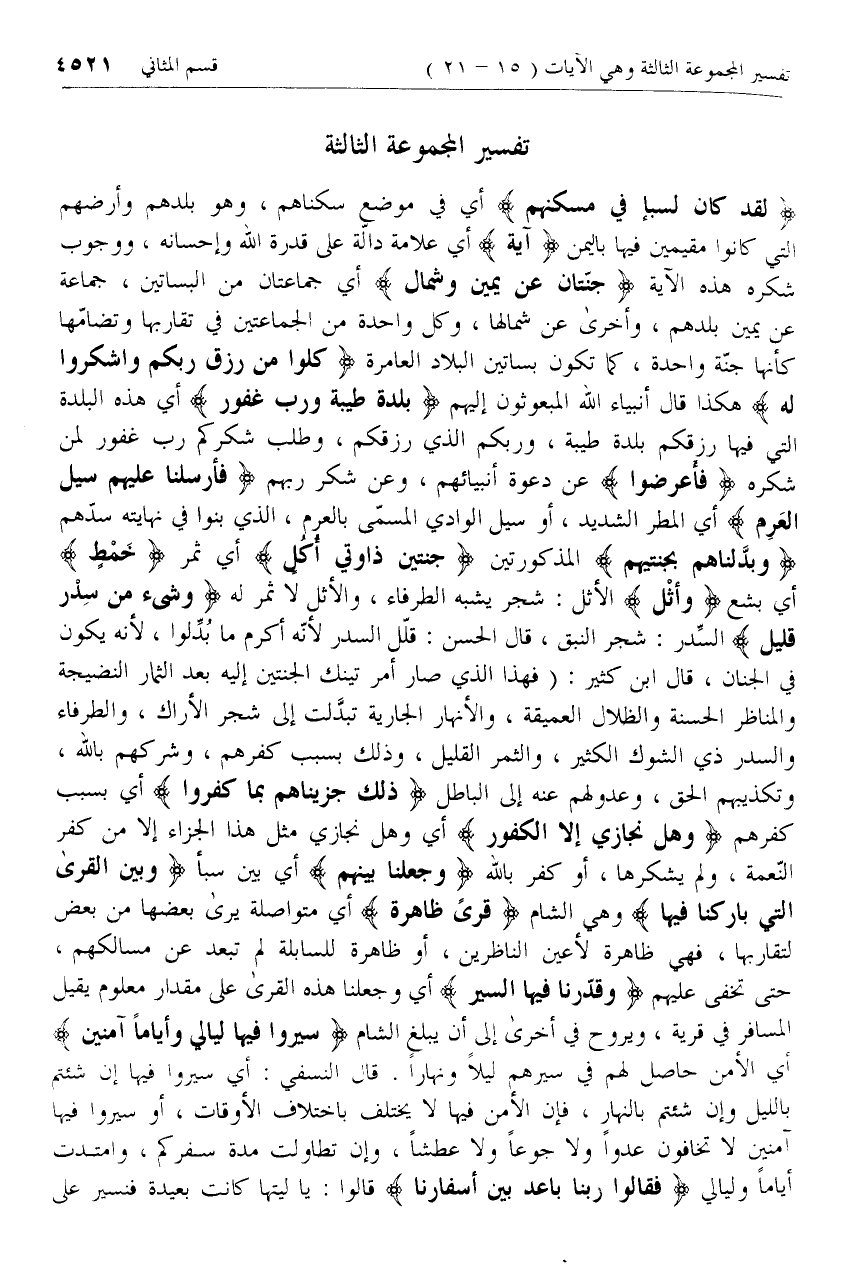 فَأَعْرَضُوا عن دعوة أنبيائهم، وعن شكر ربهم فَأَرْسَلْنا عَلَيْهِمْ سَيْلَ الْعَرِمِ أي المطر الشديد، أو سيل الوادي المسمّى بالعرم، الذي بنوا في نهايته سدّهم وَبَدَّلْناهُمْ بِجَنَّتَيْهِمْ المذكورتين جَنَّتَيْنِ ذَواتَيْ أُكُلٍ أي ثمر خَمْطٍ أي بشع وَأَثْلٍ الأثل: شجر يشبه الطرفاء، والأثل لا ثمر له وَشَيْءٍ مِنْ سِدْرٍ قَلِيلٍ السّدر: شجر النبق، قال الحسن: قلّل السدر لأنّه أكرم ما بدّلوا، لأنه يكون في الجنان، قال ابن كثير: (فهذا الذي صار أمر تينك الجنتين إليه بعد الثمار النضيجة والمناظر الحسنة والظلال العميقة، والأنهار الجارية تبدّلت إلى شجر الأراك، والطرفاء والسدر ذي الشوك الكثير، والثمر القليل، وذلك بسبب كفرهم، وشركهم بالله، وتكذيبهم الحق، وعدولهم عنه إلى الباطل