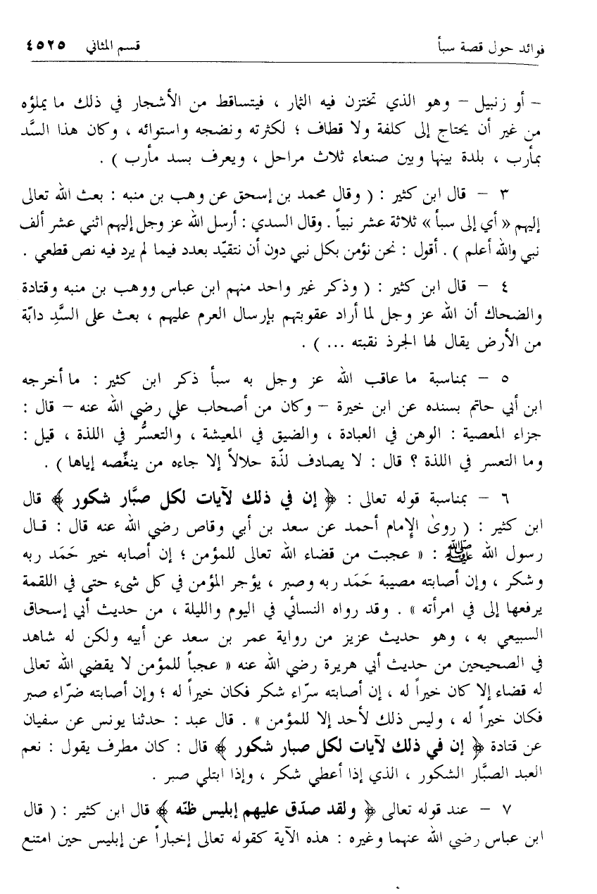 3 - قال ابن كثير: (وقال محمد بن إسحاق عن وهب بن منبه: بعث الله تعالى إليهم «أي إلى سبأ» ثلاثة عشر نبيا. وقال السدي: أرسل الله عزّ وجل إليهم اثني عشر ألف نبي والله أعلم). أقول: نحن نؤمن بكل نبي دون أن نتقيّد بعدد فيما لم يرد فيه نص قطعي.