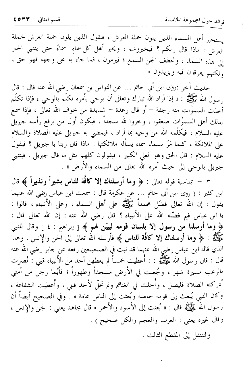 بمناسبة قوله تعالى: وَما أَرْسَلْناكَ إِلَّا كَافَّةً لِلنَّاسِ بَشِيراً وَنَذِيراً قال ابن كثير: (روى ابن أبي حاتم ... عن عكرمة قال: سمعت ابن عباس رضي الله عنهما يقول: إن الله تعالى فضّل محمدا صلّى الله عليه وسلم على أهل السماء، وعلى الأنبياء، قالوا: