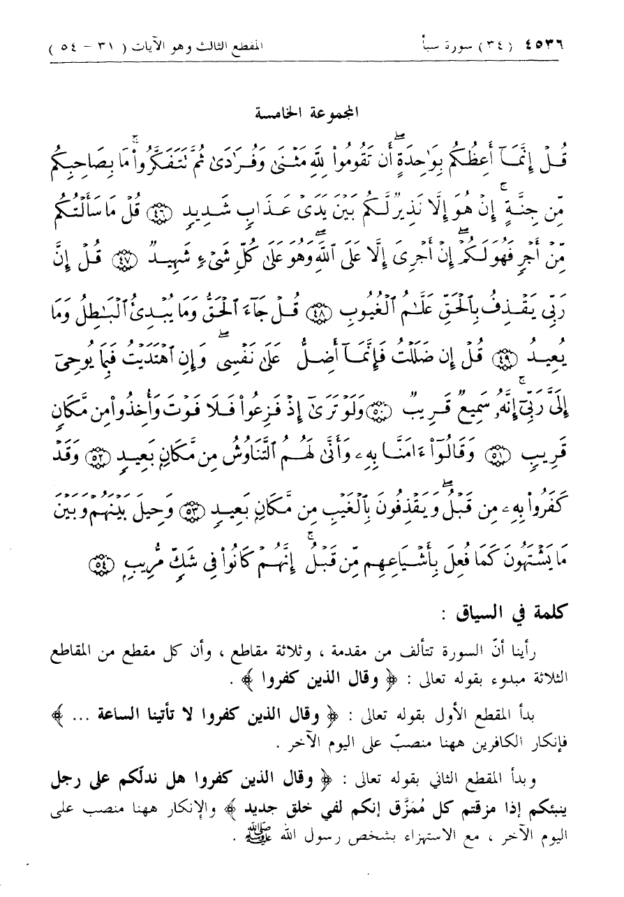 بدأ المقطع الأول بقوله تعالى: وَقالَ الَّذِينَ كَفَرُوا لا تَأْتِينَا السَّاعَةُ ...