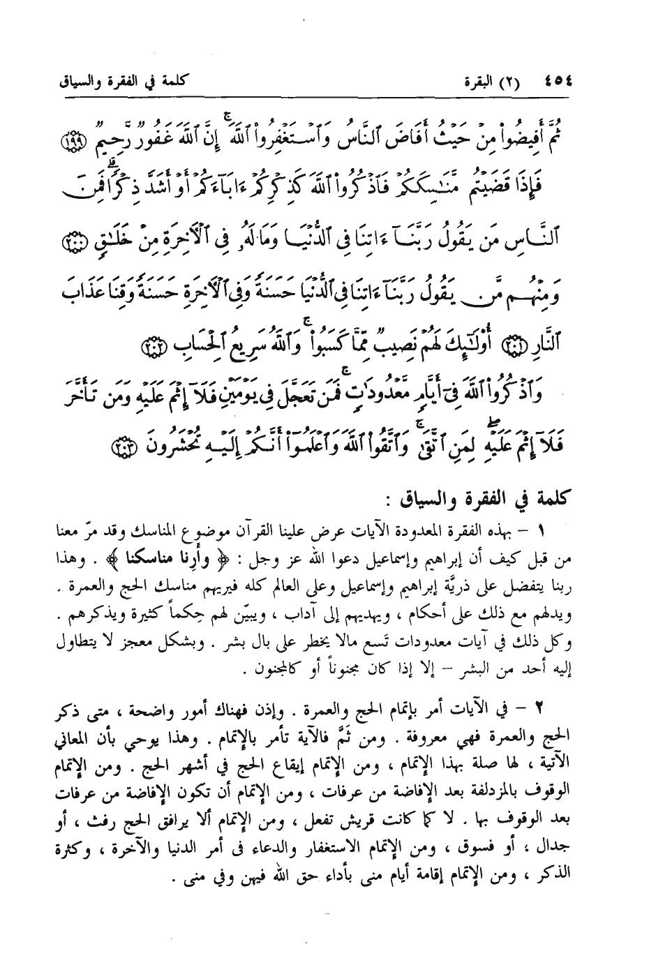2 - في الآيات أمر بإتمام الحج والعمرة. وإذن فهناك أمور واضحة، متى ذكر الحج والعمرة فهي معروفة. ومن ثم فالآية تأمر بالإتمام. وهذا يوحي بأن المعاني الآتية، لها صلة بهذا الإتمام، ومن الإتمام إيقاع الحج في أشهر الحج. ومن الإتمام الوقوف بالمزدلفة بعد الإفاضة من عرفات، ومن الإتمام أن تكون الإفاضة من عرفات بعد الوقوف بها. لا كما كانت قريش تفعل، ومن الإتمام ألا يرافق الحج رفث، أو جدال، أو فسوق، ومن الإتمام الاستغفار والدعاء فى أمر الدنيا والآخرة، وكثرة الذكر، ومن الإتمام إقامة أيام منى بأداء حق الله فيهن وفي منى.