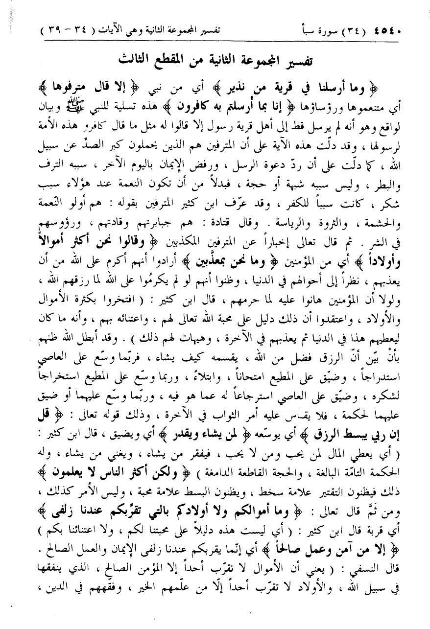 وَما أَرْسَلْنا فِي قَرْيَةٍ مِنْ نَذِيرٍ أي من نبي إِلَّا قالَ مُتْرَفُوها أي متنعموها ورؤساؤها إِنَّا بِما أُرْسِلْتُمْ بِهِ كافِرُونَ هذه تسلية للنبي صلّى الله عليه وسلم وبيان لواقع وهو أنه لم يرسل قط إلى أهل قرية رسول إلا قالوا له مثل ما قال كافرو هذه الأمة لرسولها، وقد دلّت هذه الآية على أن المترفين هم الذين يحملون كبر الصدّ عن سبيل الله، كما دلّت على أن ردّ دعوة الرسل، ورفض الإيمان باليوم الآخر، سببه الترف والبطر، وليس سببه شبهة أو حجة، فبدلا من أن تكون النعمة عند هؤلاء سبب شكر، كانت سببا للكفر، وقد عرّف ابن كثير المترفين بقوله: هم أولو النّعمة والحشمة، والثروة والرئاسة. وقال قتادة: هم جبابرتهم وقادتهم، ورءوسهم في الشر.