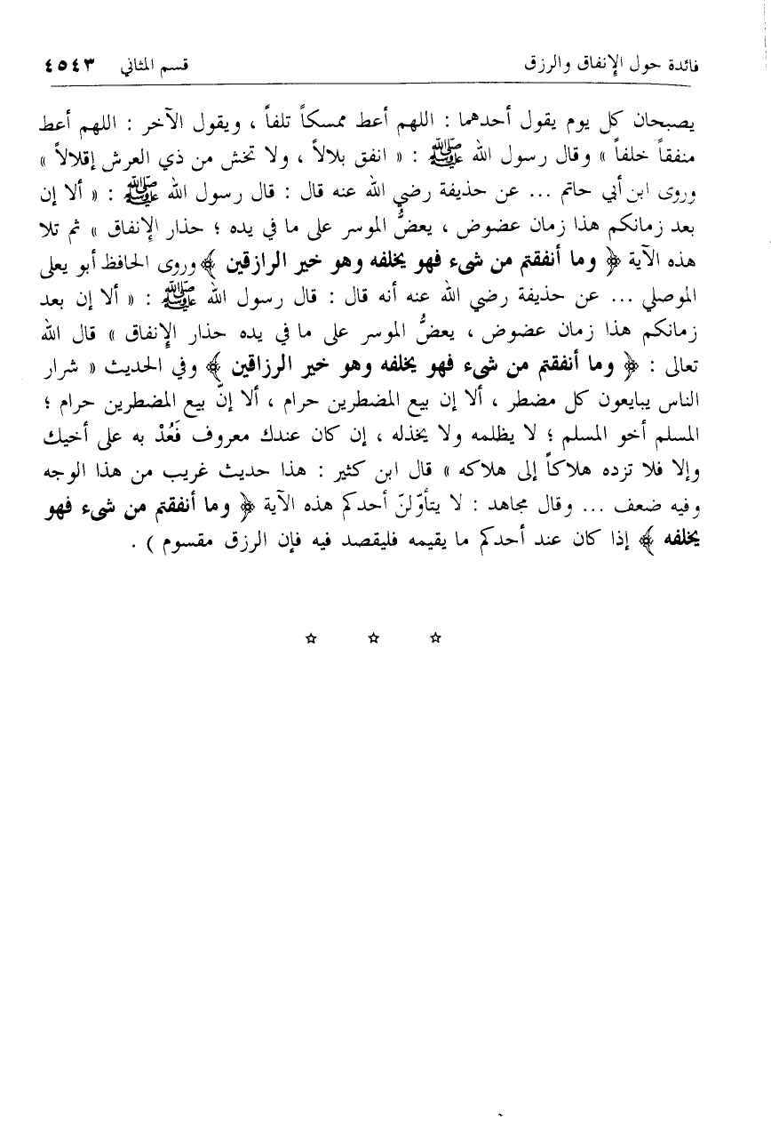 يصبحان كل يوم يقول أحدهما: اللهم أعط ممسكا تلفا، ويقول الآخر: اللهم أعط منفقا خلفا» وقال رسول الله صلّى الله عليه وسلم: «انفق بلالا، ولا تخش من ذي العرش إقلالا» وروى ابن أبي حاتم ... عن حذيفة رضي الله عنه قال: قال رسول الله صلّى الله عليه وسلم: «ألا إن بعد زمانكم هذا زمان عضوض، يعضّ الموسر على ما في يده؛ حذار الإنفاق» ثم تلا هذه الآية وَما أَنْفَقْتُمْ مِنْ شَيْءٍ فَهُوَ يُخْلِفُهُ وَهُوَ خَيْرُ الرَّازِقِينَ وروى الحافظ أبو يعلى الموصلي ... عن حذيفة رضي الله عنه أنه قال: قال رسول الله صلّى الله عليه وسلم: «ألا إن بعد زمانكم هذا زمان عضوض، يعضّ الموسر على ما في يده حذار الإنفاق» قال الله تعالى: وَما أَنْفَقْتُمْ مِنْ شَيْءٍ فَهُوَ يُخْلِفُهُ وَهُوَ خَيْرُ الرَّازِقِينَ وفي الحديث «شرار الناس يبايعون كل مضطر، ألا إن بيع المضطرين حرام، ألا إنّ بيع المضطرين حرام؛ المسلم أخو المسلم؛ لا يظلمه ولا يخذله، إن كان عندك معروف فعد به على أخيك وإلا فلا تزده هلاكا إلى هلاكه» قال ابن كثير: هذا حديث غريب من هذا الوجه وفيه ضعف ... وقال مجاهد: لا يتأوّلنّ أحدكم هذه الآية وَما أَنْفَقْتُمْ مِنْ شَيْءٍ فَهُوَ يُخْلِفُهُ إذا كان عند أحدكم ما يقيمه فليقصد فيه فإن الرزق مقسوم).