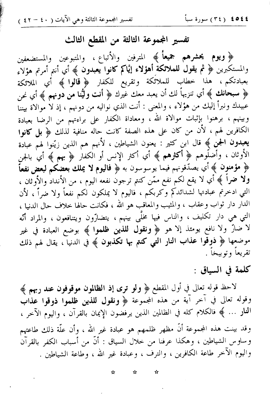 لاحظ قوله تعالى في أول المقطع وَلَوْ تَرى إِذِ الظَّالِمُونَ مَوْقُوفُونَ عِنْدَ رَبِّهِمْ وقوله تعالى في آخر آية من هذه المجموعة وَنَقُولُ لِلَّذِينَ ظَلَمُوا ذُوقُوا عَذابَ النَّارِ ... فالكلام كله في الظالمين الذين يرفضون الإيمان بالقرآن، واليوم الآخر، وقد بينت هذه المجموعة أنّ مظهر ظلمهم هو عبادة غير الله، وأن علّة ذلك طاعتهم وساوس الشياطين، وهكذا عرفنا من خلال السياق: أنّ من أسباب الكفر بالقرآن واليوم الآخر طاعة الكافرين، والترف، وعبادة غير الله، وطاعة الشياطين.