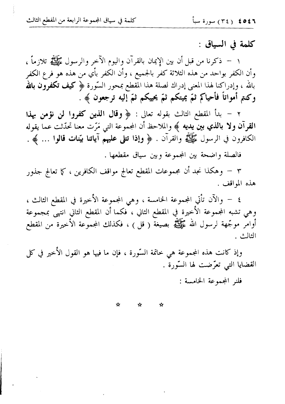 3 - وهكذا نجد أن مجموعات المقطع تعالج مواقف الكافرين، كما تعالج جذور هذه المواقف.