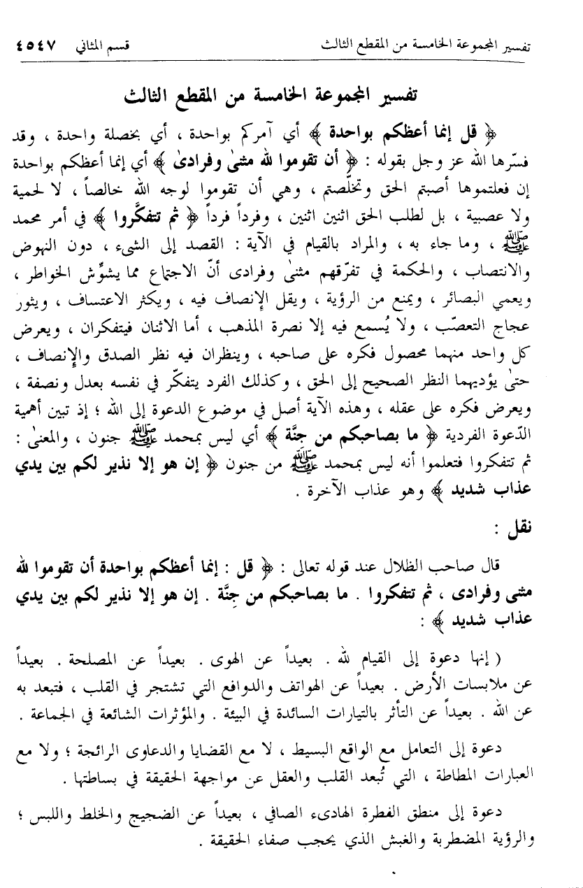 قال صاحب الظلال عند قوله تعالى: قُلْ: إِنَّما أَعِظُكُمْ بِواحِدَةٍ أَنْ تَقُومُوا لِلَّهِ مَثْنى وَفُرادى، ثُمَّ تَتَفَكَّرُوا. ما بِصاحِبِكُمْ مِنْ جِنَّةٍ. إِنْ هُوَ إِلَّا نَذِيرٌ لَكُمْ بَيْنَ يَدَيْ عَذابٍ شَدِيدٍ: