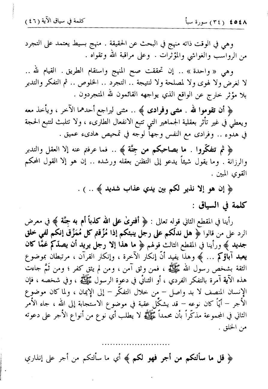 رأينا في المقطع الثاني قوله تعالى: أَفْتَرى عَلَى اللَّهِ كَذِباً أَمْ بِهِ جِنَّةٌ في معرض الرد على من قالوا هَلْ نَدُلُّكُمْ عَلى رَجُلٍ يُنَبِّئُكُمْ إِذا مُزِّقْتُمْ كُلَّ مُمَزَّقٍ إِنَّكُمْ لَفِي خَلْقٍ جَدِيدٍ ورأينا في المقطع الثالث قولهم ما هذا إِلَّا رَجُلٌ يُرِيدُ أَنْ يَصُدَّكُمْ عَمَّا كانَ يَعْبُدُ آباؤُكُمْ ... وهذا يفيد أنّ إنكار الآخرة، وإنكار القرآن، مرتبطان بموضوع الثقة بشخص رسول الله صلّى الله عليه وسلم، فمن وثق آمن، ومن لم يثق كفر؛ ومن ثمّ جاءت هذه الآية آمرة بالتفكر الفردي، أو الثنائي في دعوة الرسول صلّى الله عليه وسلم، وفي شخصه، فإن الإنسان المنصف لا بد واصل- من خلال التفكّر- إلى الإيمان، ولما كان موضوع الأجر- أيّا كان نوعه- قد يشكّل عقبة في موضوع الاستجابة إلى الله، جاء الأمر الثاني في المجموعة مذكّرا بأن محمدا صلّى الله عليه وسلم لا يطلب أي نوع من أنواع الأجر على دعوته من الخلق.