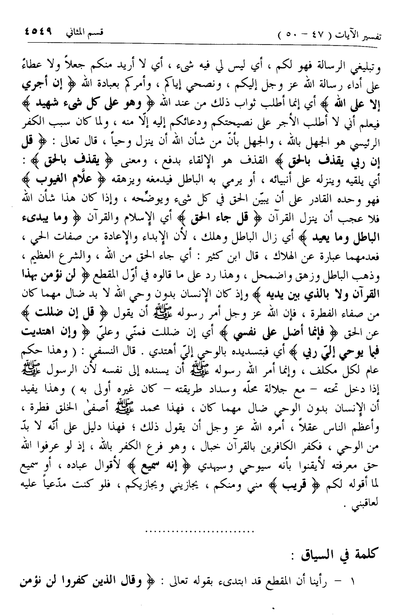 فإن الله عزّ وجل أمر رسوله صلّى الله عليه وسلم أن يقول قُلْ إِنْ ضَلَلْتُ عن الحق فَإِنَّما أَضِلُّ عَلى نَفْسِي أي إن ضللت فمنّي وعليّ وَإِنِ اهْتَدَيْتُ فَبِما يُوحِي إِلَيَّ رَبِّي أي فبتسديده بالوحي إليّ أهتدي. قال النسفي: (وهذا حكم عام لكل مكلف، وإنما أمر الله رسوله صلّى الله عليه وسلم أن يسنده إلى نفسه لأن الرسول صلّى الله عليه وسلم إذا دخل تحته- مع جلالة محلّه وسداد طريقته- كان غيره أولى به) وهذا يفيد أن الإنسان بدون الوحي ضال مهما كان، فهذا محمد صلّى الله عليه وسلم أصفى الخلق فطرة، وأعظم الناس عقلا، أمره الله عزّ وجل أن يقول ذلك؛ فهذا دليل على أنّه لا بدّ من الوحي، فكفر الكافرين بالقرآن خبال، وهو فرع الكفر بالله، إذ لو عرفوا الله حق معرفته لأيقنوا بأنه سيوحي وسيهدي إِنَّهُ سَمِيعٌ لأقوال عباده، أو سميع لما أقوله لكم قَرِيبٌ مني ومنكم، يجازيني ويجازيكم، فلو كنت مدّعيا عليه لعاقبني.