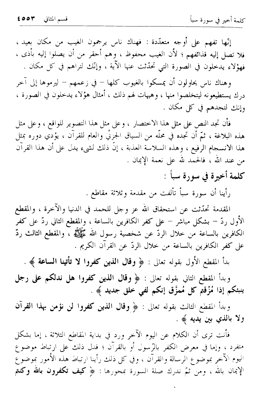 وبدأ المقطع الثالث بقوله تعالى: وَقالَ الَّذِينَ كَفَرُوا لَنْ نُؤْمِنَ بِهذَا الْقُرْآنِ وَلا بِالَّذِي بَيْنَ يَدَيْهِ.