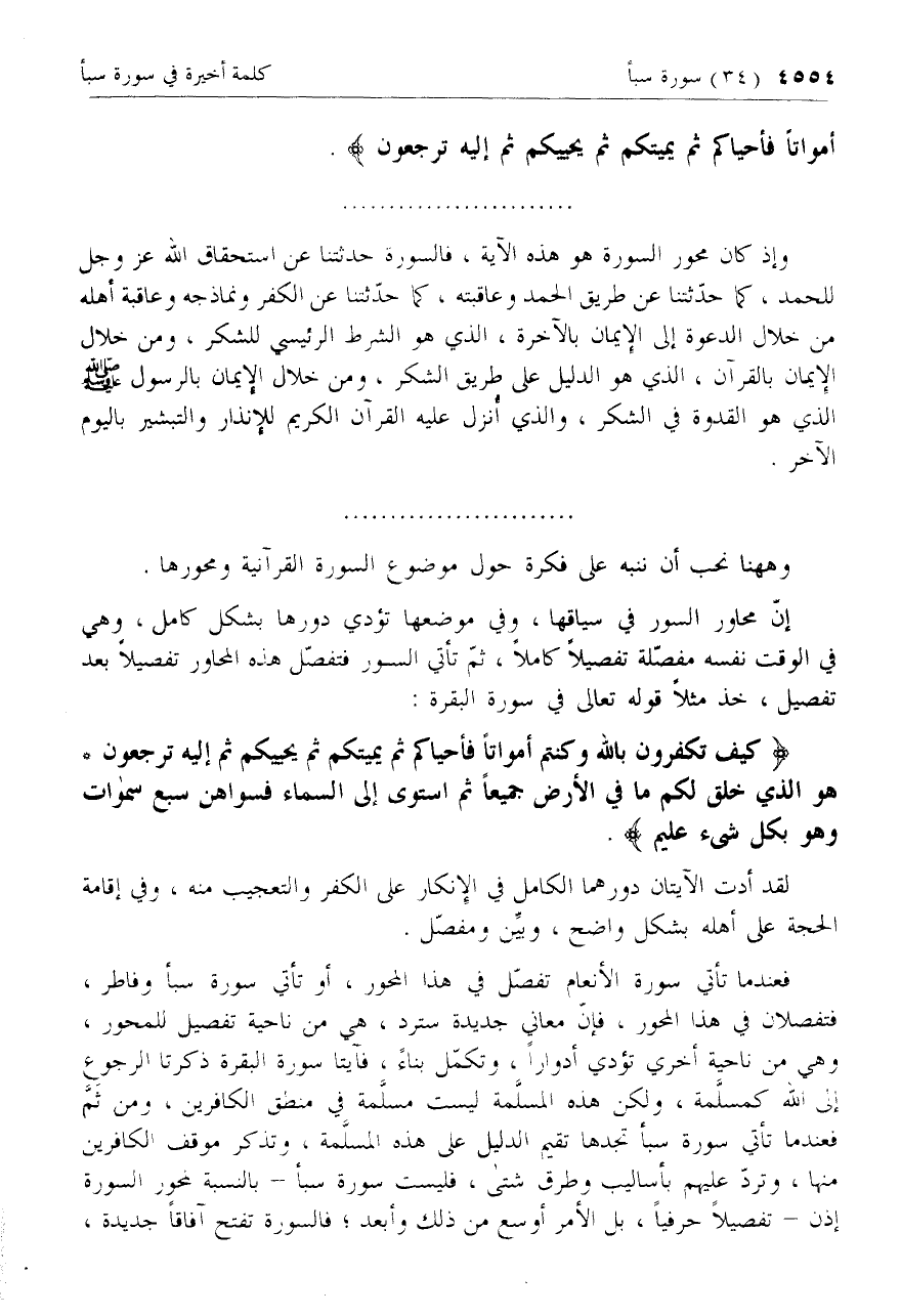 فعند ما تأتي سورة الأنعام تفصّل في هذا المحور، أو تأتي سورة سبأ وفاطر، فتفصلان في هذا المحور، فإنّ معاني جديدة سترد، هي من ناحية تفصيل للمحور، وهي من ناحية أخري تؤدي أدوارا، وتكمّل بناء، فآيتا سورة البقرة ذكرتا الرجوع إلى الله كمسلّمة، ولكن هذه المسلّمة ليست مسلّمة في منطق الكافرين، ومن ثمّ فعند ما تأتي سورة سبأ تجدها تقيم الدليل على هذه المسلّمة، وتذكر موقف الكافرين منها، وتردّ عليهم بأساليب وطرق شتى، فليست سورة سبأ- بالنسبة لمحور السورة إذن- تفصيلا حرفيا، بل الأمر أوسع من ذلك وأبعد؛ فالسورة تفتح آفاقا جديدة،