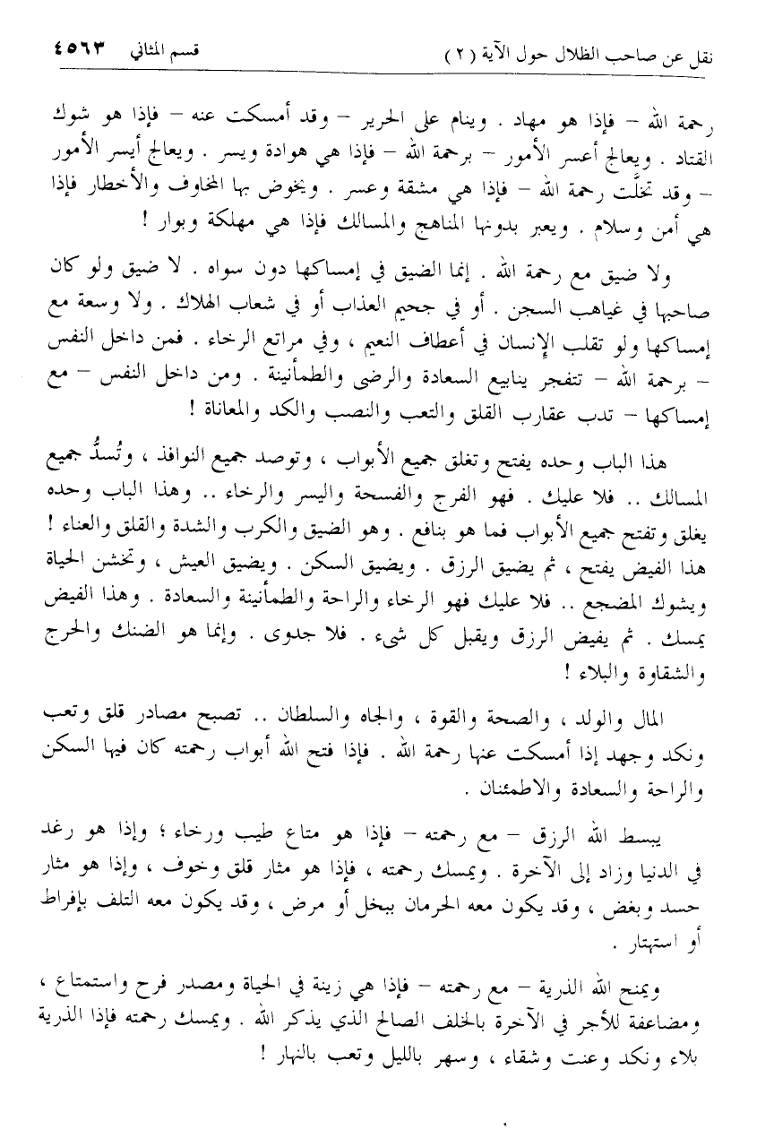 ولا ضيق مع رحمة الله. إنما الضيق في إمساكها دون سواه. لا ضيق ولو كان صاحبها في غياهب السجن. أو في جحيم العذاب أو في شعاب الهلاك. ولا وسعة مع إمساكها ولو تقلب الإنسان في أعطاف النعيم، وفي مراتع الرخاء. فمن داخل النفس- برحمة الله- تتفجر ينابيع السعادة والرضى والطمأنينة. ومن داخل النفس- مع إمساكها- تدب عقارب القلق والتعب والنصب والكد والمعاناة!