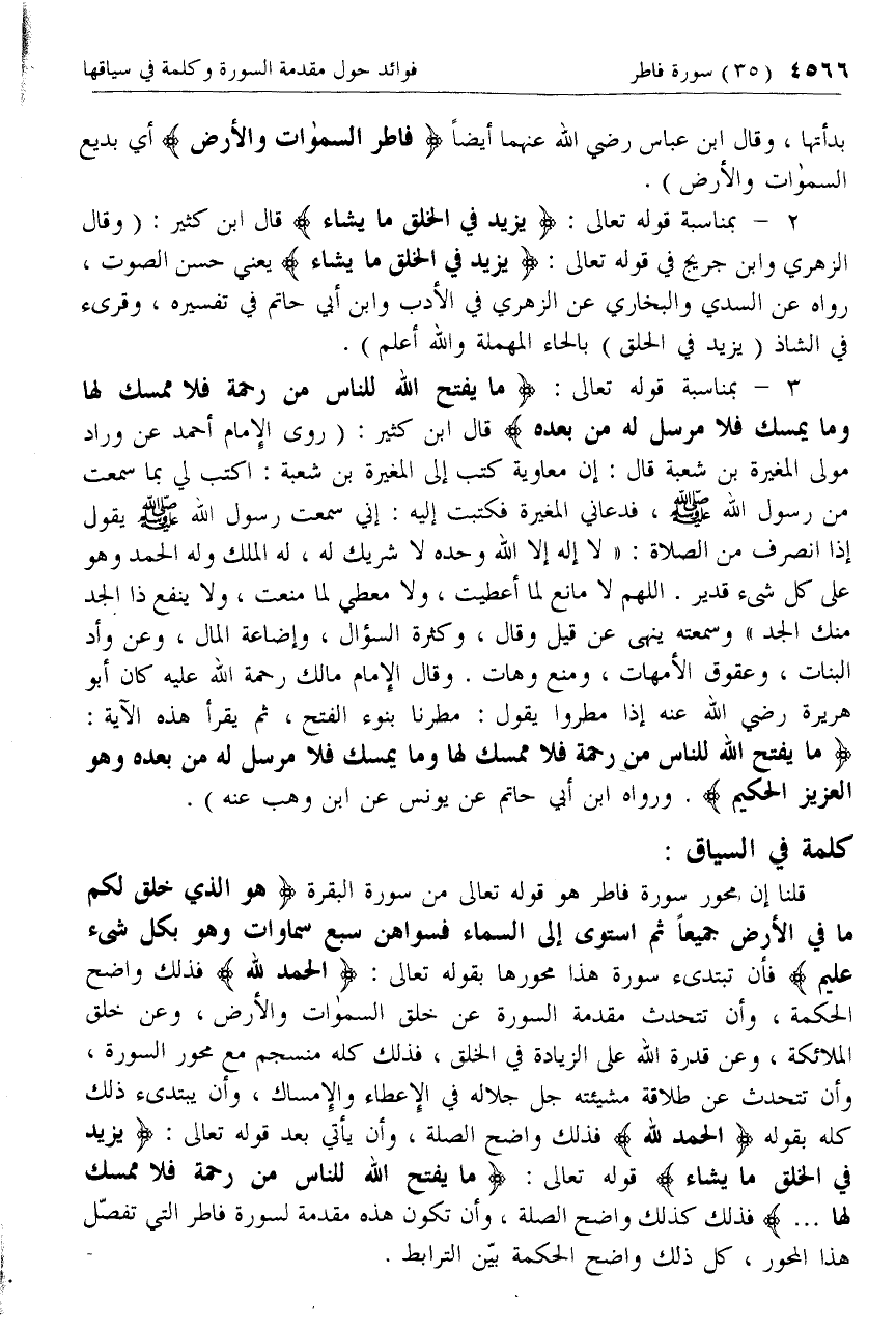 قلنا إن محور سورة فاطر هو قوله تعالى من سورة البقرة هُوَ الَّذِي خَلَقَ لَكُمْ ما فِي الْأَرْضِ جَمِيعاً ثُمَّ اسْتَوى إِلَى السَّماءِ فَسَوَّاهُنَّ سَبْعَ سَماواتٍ وَهُوَ بِكُلِّ شَيْءٍ عَلِيمٌ فإن تبتدئ سورة هذا محورها بقوله تعالى: الْحَمْدُ لِلَّهِ فذلك واضح الحكمة، وأن تتحدث مقدمة السورة عن خلق السموات والأرض، وعن خلق الملائكة، وعن قدرة الله على الزيادة في الخلق، فذلك كله منسجم مع محور السورة، وأن تتحدث عن طلاقة مشيئته جل جلاله في الإعطاء والإمساك، وأن يبتدئ ذلك كله بقوله الْحَمْدُ لِلَّهِ فذلك واضح الصلة، وأن يأتي بعد قوله تعالى: يَزِيدُ فِي الْخَلْقِ ما يَشاءُ قوله تعالى: ما يَفْتَحِ اللَّهُ لِلنَّاسِ مِنْ رَحْمَةٍ فَلا مُمْسِكَ لَها ... فذلك كذلك واضح الصلة، وأن تكون هذه مقدمة لسورة فاطر التي تفصّل هذا المحور، كل ذلك واضح الحكمة بيّن الترابط.