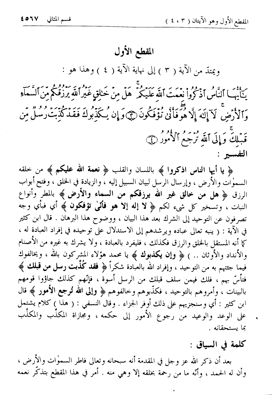 يا أَيُّهَا النَّاسُ اذْكُرُوا باللسان والقلب نِعْمَتَ اللَّهِ عَلَيْكُمْ من خلقه السموات والأرض، وإرسال الرسل لبيان السبيل إليه، والزيادة في الخلق، وفتح أبواب الرزق هَلْ مِنْ خالِقٍ غَيْرُ اللَّهِ يَرْزُقُكُمْ مِنَ السَّماءِ وَالْأَرْضِ بالمطر وأنواع النبات، وتسخير كل شئ لكم لا إِلهَ إِلَّا هُوَ فَأَنَّى تُؤْفَكُونَ أي فبأي وجه تصرفون عن التوحيد إلى الشرك بعد هذا البيان، ووضوح هذا البرهان. قال ابن كثير في الآية: (ينبه تعالى عباده ويرشدهم إلى الاستدلال على توحيده في إفراد العبادة له، كما أنه المستقل بالخلق والرزق فكذلك، فليفرد بالعبادة، ولا يشرك به غيره من الأصنام والأنداد والأوثان .. )