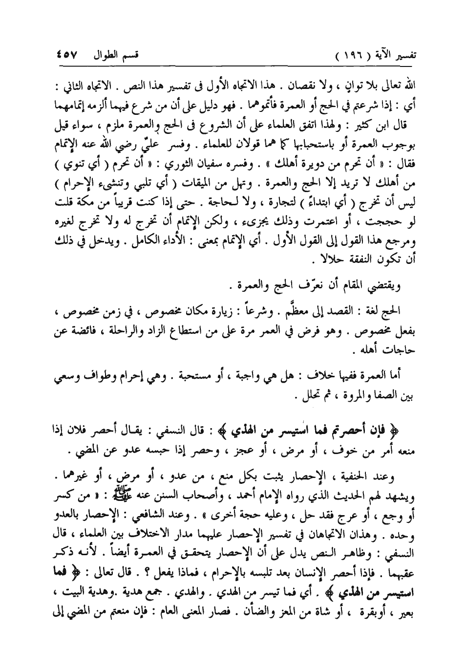 ويشهد لهم الحديث الذي رواه الإمام أحمد، وأصحاب السنن عنه صلى الله عليه وسلم: «من كسر أو وجع، أو عرج فقد حل، وعليه حجة أخرى». وعند الشافعي: الإحصار بالعدو وحده. وهذان الاتجاهان في تفسير الإحصار عليهما مدار الاختلاف بين العلماء، قال النسفي: وظاهر النص يدل على أن الإحصار يتحقق في العمرة أيضا. لأنه ذكر عقبهما. فإذا أحصر الإنسان بعد تلبسه بالإحرام، فماذا يفعل؟. قال تعالى: فَمَا اسْتَيْسَرَ مِنَ الْهَدْيِ. أي فما تيسر من الهدي. والهدي. جمع هدية. وهدية البيت، بعير، أو بقرة، أو شاة من المعز والضأن. فصار المعنى العام: فإن منعتم من المضي إلى