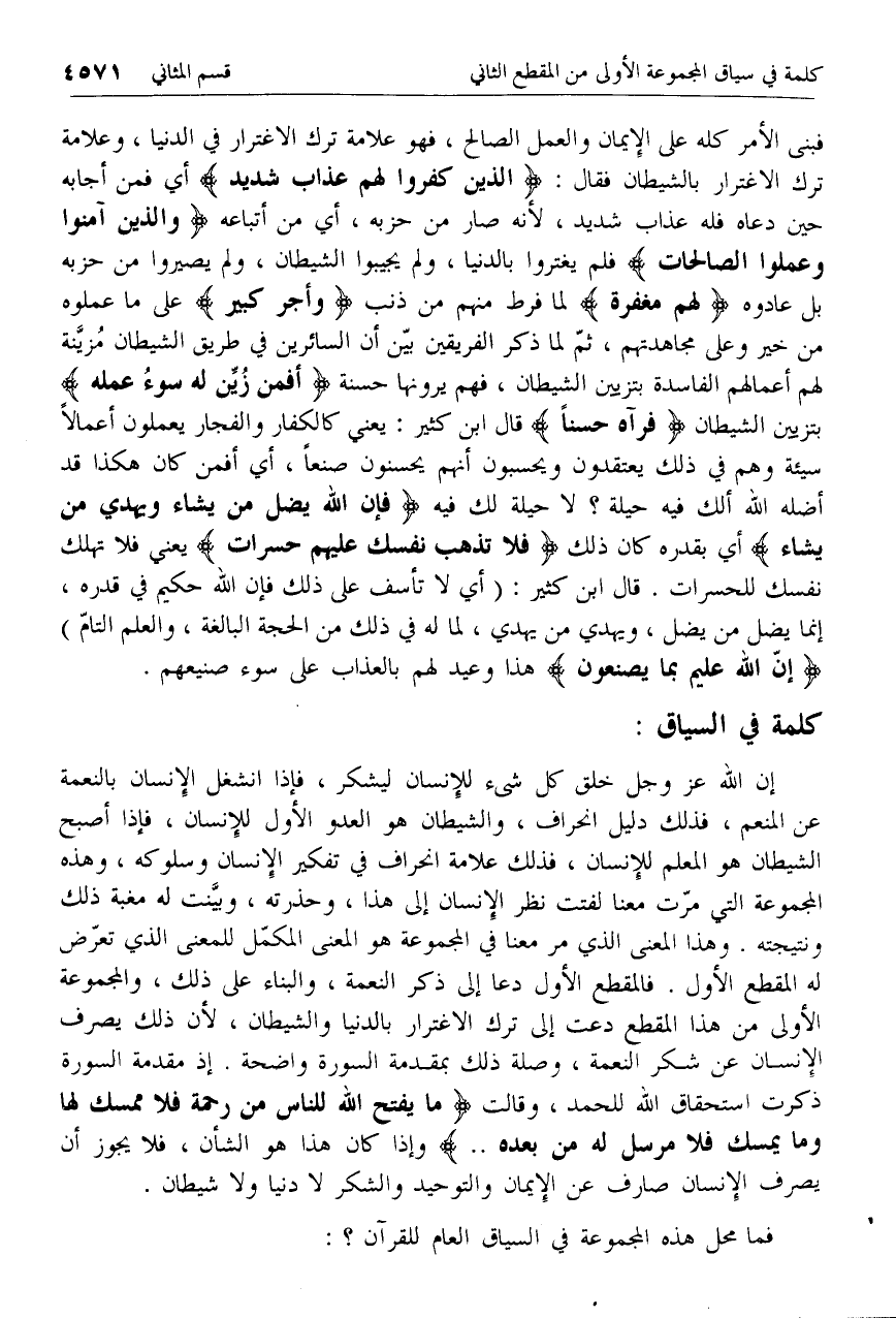 إن الله عزّ وجل خلق كل شئ للإنسان ليشكر، فإذا انشغل الإنسان بالنعمة عن المنعم، فذلك دليل انحراف، والشيطان هو العدو الأول للإنسان، فإذا أصبح الشيطان هو المعلم للإنسان، فذلك علامة انحراف في تفكير الإنسان وسلوكه، وهذه المجموعة التي مرّت معنا لفتت نظر الإنسان إلى هذا، وحذرته، وبيّنت له مغبة ذلك ونتيجته. وهذا المعنى الذي مر معنا في المجموعة هو المعنى المكمّل للمعنى الذي تعرّض له المقطع الأول. فالمقطع الأول دعا إلى ذكر النعمة، والبناء على ذلك، والمجموعة الأولى من هذا المقطع دعت إلى ترك الاغترار بالدنيا والشيطان، لأن ذلك يصرف الإنسان عن شكر النعمة، وصلة ذلك بمقدمة السورة واضحة. إذ مقدمة السورة ذكرت استحقاق الله للحمد، وقالت ما يَفْتَحِ اللَّهُ لِلنَّاسِ مِنْ رَحْمَةٍ فَلا مُمْسِكَ لَها وَما يُمْسِكْ فَلا مُرْسِلَ لَهُ مِنْ بَعْدِهِ .. وإذا كان هذا هو الشأن، فلا يجوز أن يصرف الإنسان صارف عن الإيمان والتوحيد والشكر لا دنيا ولا شيطان.
