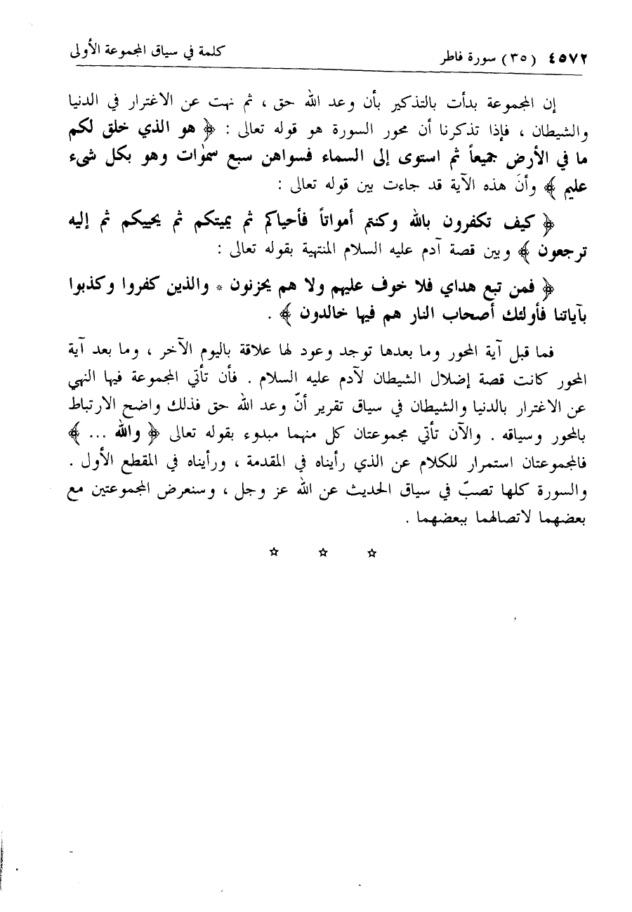 فما قبل آية المحور وما بعدها توجد وعود لها علاقة باليوم الآخر، وما بعد آية المحور كانت قصة إضلال الشيطان لآدم عليه السلام. فإن تأتي المجموعة فيها النهي عن الاغترار بالدنيا والشيطان في سياق تقرير أنّ وعد الله حق فذلك واضح الارتباط بالمحور وسياقه. والآن تأتي مجموعتان كل منهما مبدوء بقوله تعالى وَاللَّهُ ...