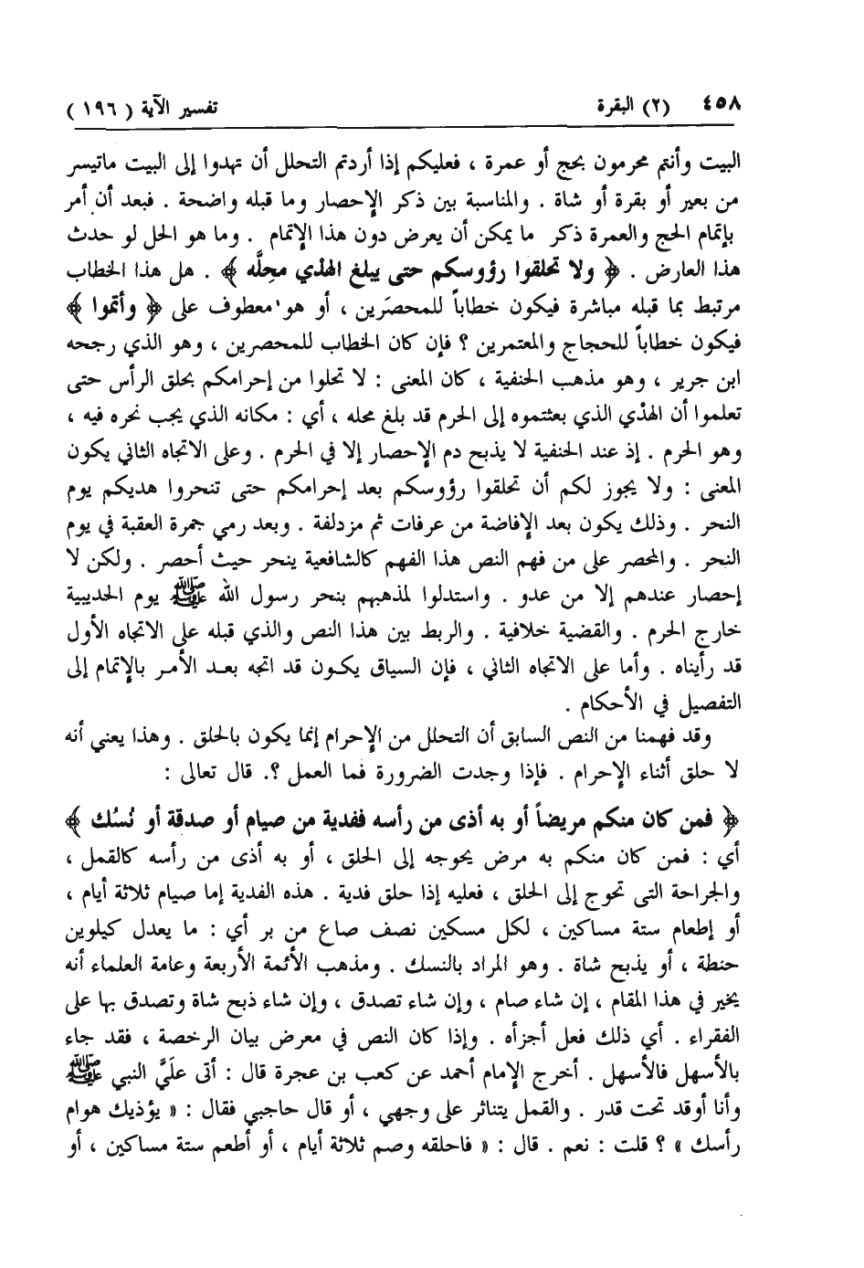 البيت وأنتم محرمون بحج أو عمرة، فعليكم إذا أردتم التحلل أن تهدوا إلى البيت ما تيسر من بعير أو بقرة أو شاة. والمناسبة بين ذكر الإحصار وما قبله واضحة. فبعد أن أمر بإتمام الحج والعمرة ذكر ما يمكن أن يعرض دون هذا الإتمام. وما هو الحل لو حدث هذا العارض. وَلا تَحْلِقُوا رُؤُسَكُمْ حَتَّى يَبْلُغَ الْهَدْيُ مَحِلَّهُ. هل هذا الخطاب مرتبط بما قبله مباشرة فيكون خطابا للمحصرين، أو هو معطوف على وَأَتِمُّوا فيكون خطابا للحجاج والمعتمرين؟ فإن كان الخطاب للمحصرين، وهو الذي رجحه ابن جرير، وهو مذهب الحنفية، كان المعنى: لا تحلوا من إحرامكم بحلق الرأس حتى تعلموا أن الهدي الذي بعثتموه إلى الحرم قد بلغ محله، أي: مكانه الذي يجب نحره فيه، وهو الحرم. إذ عند الحنفية لا يذبح دم الإحصار إلا في الحرم. وعلى الاتجاه الثاني يكون المعنى: ولا يجوز لكم أن تحلقوا رءوسكم بعد إحرامكم حتى تنحروا هديكم يوم النحر. وذلك يكون بعد الإفاضة من عرفات ثم مزدلفة. وبعد رمي جمرة العقبة في يوم النحر. والمحصر على من فهم النص هذا الفهم كالشافعية ينحر حيث أحصر. ولكن لا إحصار عندهم إلا من عدو. واستدلوا لمذهبهم بنحر رسول الله صلى الله عليه وسلم يوم الحديبية خارج الحرم. والقضية خلافية. والربط بين هذا النص والذي قبله على الاتجاه الأول قد رأيناه. وأما على الاتجاه الثاني، فإن السياق يكون قد اتجه بعد الأمر بالإتمام إلى التفصيل في الأحكام.