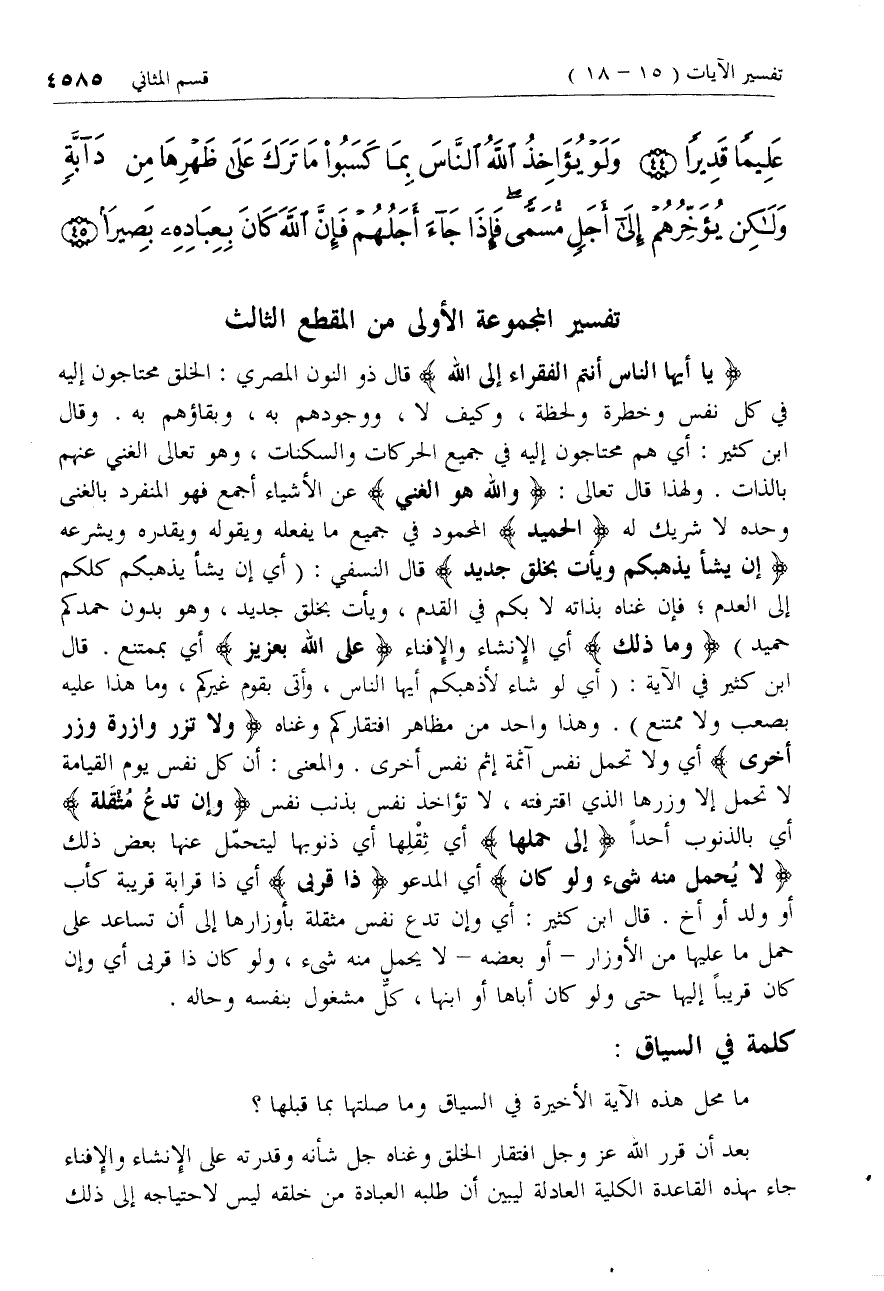 يا أَيُّهَا النَّاسُ أَنْتُمُ الْفُقَراءُ إِلَى اللَّهِ قال ذو النون المصري: الخلق محتاجون إليه في كل نفس وخطرة ولحظة، وكيف لا، ووجودهم به، وبقاؤهم به. وقال ابن كثير: أي هم محتاجون إليه في جميع الحركات والسكنات، وهو تعالى الغني عنهم بالذات. ولهذا قال تعالى: وَاللَّهُ هُوَ الْغَنِيُّ عن الأشياء أجمع فهو المنفرد بالغنى وحده لا شريك له الْحَمِيدُ المحمود في جميع ما يفعله ويقوله ويقدره ويشرعه