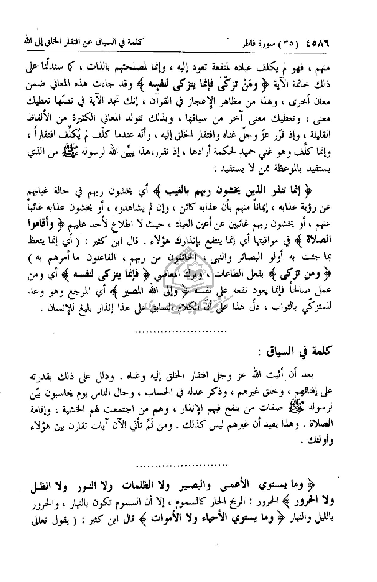 بعد أن أثبت الله عزّ وجل افتقار الخلق إليه وغناه. ودلل على ذلك بقدرته على إفنائهم، وخلق غيرهم، وذكر عدله في الحساب، وحال الناس يوم يحاسبون بيّن لرسوله صلّى الله عليه وسلم صفات من ينفع فيهم الإنذار، وهم من اجتمعت لهم الخشية، وإقامة الصلاة. وهذا يفيد أن غيرهم ليس كذلك. ومن ثمّ تأتي الآن آيات تقارن بين هؤلاء وأولئك.