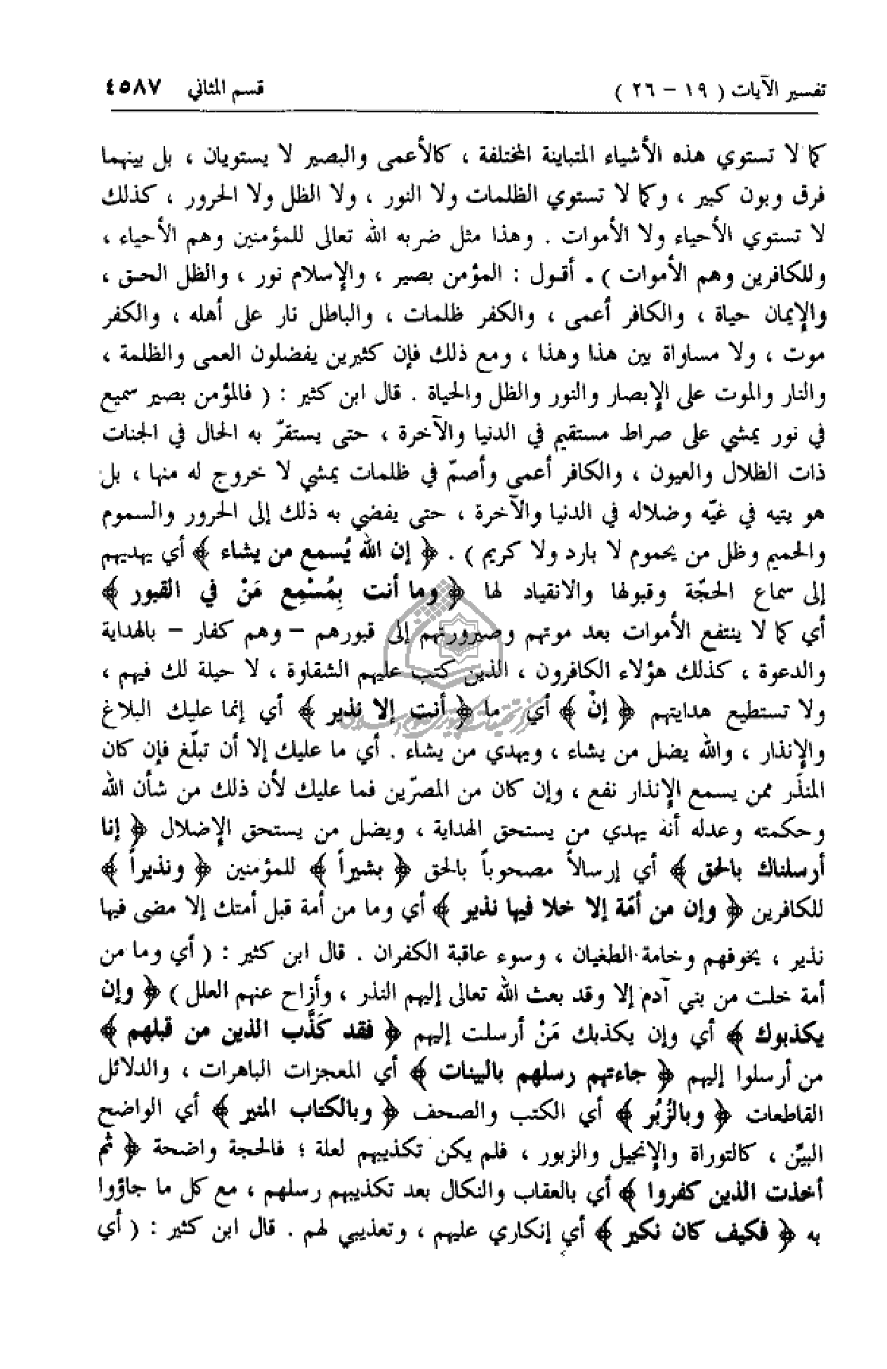 كما لا تستوي هذه الأشياء المتباينة المختلفة، كالأعمى والبصير لا يستويان، بل بينهما فرق وبون كبير، وكما لا تستوي الظلمات ولا النور، ولا الظل ولا الحرور، كذلك لا تستوي الأحياء ولا الأموات. وهذا مثل ضربه الله تعالى للمؤمنين وهم الأحياء، وللكافرين وهم الأموات). أقول: المؤمن بصير، والإسلام نور، والظل الحق، والإيمان حياة، والكافر أعمى، والكفر ظلمات، والباطل نار على أهله، والكفر موت، ولا مساواة بين هذا وهذا، ومع ذلك فإن كثيرين يفضلون العمى والظلمة، والنار والموت على الإبصار والنور والظل والحياة. قال ابن كثير: (فالمؤمن بصير سميع في نور يمشي على صراط مستقيم في الدنيا والآخرة، حتى يستقرّ به الحال في الجنات ذات الظلال والعيون، والكافر أعمى وأصمّ في ظلمات يمشي لا خروج له منها، بل هو يتيه في غيّه وضلاله في الدنيا والآخرة، حتى يفضي به ذلك إلى الحرور والسموم والحميم وظل من يحموم لا بارد ولا كريم). إِنَّ اللَّهَ يُسْمِعُ مَنْ يَشاءُ أي يهديهم إلى سماع الحجّة وقبولها والانقياد لها وَما أَنْتَ بِمُسْمِعٍ مَنْ فِي الْقُبُورِ أي كما لا ينتفع الأموات بعد موتهم وصيرورتهم إلى قبورهم- وهم كفار- بالهداية والدعوة، كذلك هؤلاء الكافرون، الذين كتب عليهم الشقاوة، لا حيلة لك فيهم، ولا تستطيع هدايتهم