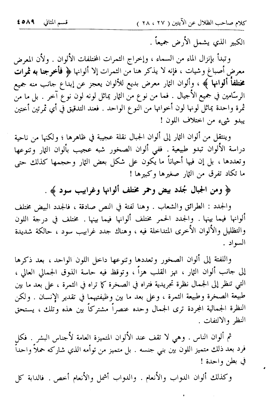 واللفتة إلى ألوان الصخور وتعددها وتنوعها داخل اللون الواحد، بعد ذكرها إلى جانب ألوان الثمار، تهز القلب هزا، وتوقظ فيه حاسة الذوق الجمالي العالي، التي تنظر إلى الجمال نظرة تجريدية فتراه في الصخرة كما تراه في الثمرة، على بعد ما بين طبيعة الصخرة وطبيعة الثمرة، وعلى بعد ما بين وظيفتيهما في تقدير الإنسان. ولكن النظرة الجمالية المجردة ترى الجمال وحده عنصرا مشتركا بين هذه وتلك، يستحق النظر والالتفات.