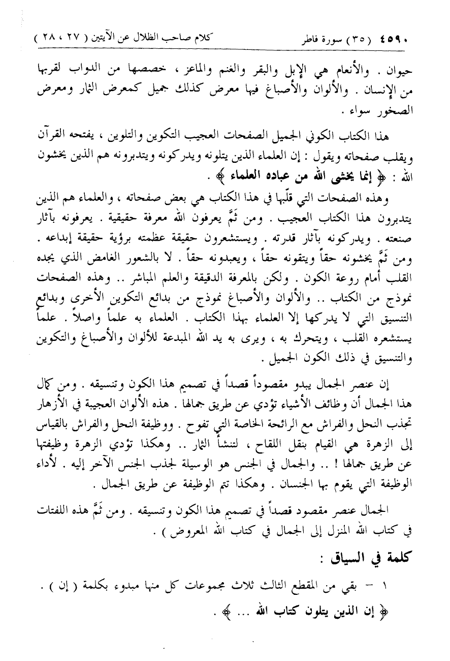 ومن ثمّ يخشونه حقا ويتقونه حقا، ويعبدونه حقا. لا بالشعور الغامض الذي يجده القلب أمام روعة الكون. ولكن بالمعرفة الدقيقة والعلم المباشر .. وهذه الصفحات نموذج من الكتاب .. والألوان والأصباغ نموذج من بدائع التكوين الأخرى وبدائع التنسيق التي لا يدركها إلا العلماء بهذا الكتاب. العلماء به علما واصلا. علما يستشعره القلب، ويتحرك به، ويرى به يد الله المبدعة للألوان والأصباغ والتكوين والتنسيق في ذلك الكون الجميل.