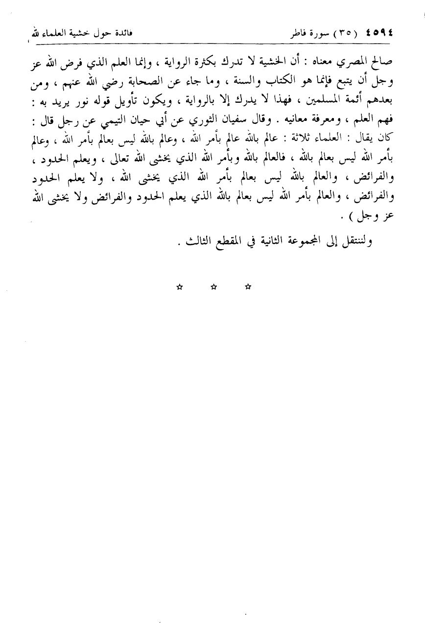 كان يقال: العلماء ثلاثة: عالم بالله عالم بأمر الله، وعالم بالله ليس بعالم بأمر الله، وعالم بأمر الله ليس بعالم بالله، فالعالم بالله وبأمر الله الذي يخشى الله تعالى، ويعلم الحدود، والفرائض، والعالم بالله ليس بعالم بأمر الله الذي يخشى الله، ولا يعلم الحدود والفرائض، والعالم بأمر الله ليس بعالم بالله الذي يعلم الحدود والفرائض ولا يخشى الله عزّ وجل).