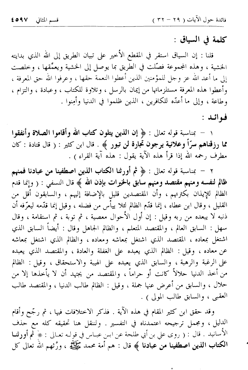 بمناسبة قوله تعالى: ثُمَّ أَوْرَثْنَا الْكِتابَ الَّذِينَ اصْطَفَيْنا مِنْ عِبادِنا فَمِنْهُمْ ظالِمٌ لِنَفْسِهِ وَمِنْهُمْ مُقْتَصِدٌ وَمِنْهُمْ سابِقٌ بِالْخَيْراتِ بِإِذْنِ اللَّهِ قال النسفي: (وإنما قدم الظالم للإيذان بكثرتهم، وأن المقتصدين قليل بالإضافة إليهم، والسابقون أقل من القليل، وقال ابن عطاء، إنما قدّم الظالم لئلا ييأس من فضله، وقيل إنما قدّمه ليعرّفه أن ذنبه لا يبعده من ربه وقيل: إن أول الأحوال معصية، ثم توبة، ثم استقامة، وقال سهل: السابق العالم، والمقتصد المتعلم، والظالم الجاهل وقال: أيضا السابق الذي اشتغل بمعاده، المقتصد الذي اشتغل بمعاشه ومعاده، والظالم الذي اشتغل بمعاشه عن معاده، وقيل: الظالم الذي يعبده على الغفلة والعادة، والمقتصد الذي يعبده على الرغبة والرهبة، والسابق الذي يعبده على الهيبة والاستحقاق، وقيل: الظالم من أخذ الدنيا حلالا كانت أو حراما، والمقتصد من يجتهد أن لا يأخذها إلا من حلال، والسابق من أعرض عنها جملة، وقيل: الظالم طالب الدنيا، والمقتصد طالب العقبى، والسابق طالب المولى).