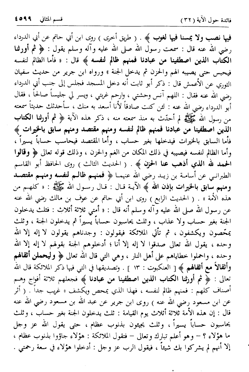 فِيها نَصَبٌ وَلا يَمَسُّنا فِيها لُغُوبٌ. (طريق أخرى) روى ابن أبي حاتم عن أبي الدرداء رضي الله عنه قال: سمعت رسول الله صلّى الله عليه وسلم يقول: ثُمَّ أَوْرَثْنَا الْكِتابَ الَّذِينَ اصْطَفَيْنا مِنْ عِبادِنا فَمِنْهُمْ ظالِمٌ لِنَفْسِهِ قال: «فأما الظالم لنفسه فيحبس حتى يصيبه الهم والحزن ثم يدخل الجنة» ورواه ابن جرير من حديث سفيان الثوري عن الأعمش قال: ذكر أبو ثابت أنه دخل المسجد فجلس إلى جنب أبي الدرداء رضي الله عنه فقال: اللهم آنس وحشتي، وارحم غربتي، ويسر لي جليسا صالحا، فقال أبو الدرداء رضي الله عنه: لئن كنت صادقا لأنا أسعد به منك، سأحدثك حديثا سمعته من رسول الله صلّى الله عليه وسلم لم أحدّث به منذ سمعته منه، ذكر هذه الآية ثُمَّ أَوْرَثْنَا الْكِتابَ الَّذِينَ اصْطَفَيْنا مِنْ عِبادِنا فَمِنْهُمْ ظالِمٌ لِنَفْسِهِ وَمِنْهُمْ مُقْتَصِدٌ وَمِنْهُمْ سابِقٌ بِالْخَيْراتِ فأما السابق بالخيرات فيدخلها بغير حساب، وأما المقتصد فيحاسب حسابا يسيرا، وأما الظالم لنفسه فيصيبه في ذلك المكان من الغم والحزن، وذلك قوله تعالى وَقالُوا الْحَمْدُ لِلَّهِ الَّذِي أَذْهَبَ عَنَّا الْحَزَنَ. (الحديث الثالث) روى الحافظ أبو القاسم الطبراني عن أسامة بن زيد رضي الله عنهما فَمِنْهُمْ ظالِمٌ لِنَفْسِهِ وَمِنْهُمْ مُقْتَصِدٌ وَمِنْهُمْ سابِقٌ بِالْخَيْراتِ بِإِذْنِ اللَّهِ الآية قال: قال رسول الله صلّى الله عليه وسلم: «كلهم من هذه الأمة». (الحديث الرابع) روى ابن أبي حاتم عن عوف بن مالك رضي الله عنه عن رسول الله صلّى الله عليه وآله وسلم أنه قال: «أمتي ثلاثة أثلاث: فثلث يدخلون الجنة بغير حساب ولا عذاب، وثلث يحاسبون حسابا يسيرا ثم يدخلون الجنة، وثلث يمحّصون ويكشفون، ثم تأتي الملائكة فيقولون: وجدناهم يقولون لا إله إلا الله وحده، يقول الله تعالى صدقوا لا إله إلا أنا؛ أدخلوهم الجنة بقولهم لا إله إلا الله وحده، واحملوا خطاياهم على أهل النار، وهي التي قال الله تعالى وَلَيَحْمِلُنَّ أَثْقالَهُمْ وَأَثْقالًا مَعَ أَثْقالِهِمْ [العنكبوت: 13]. وتصديقها في التي فيها ذكر الملائكة قال الله تعالى: ثُمَّ أَوْرَثْنَا الْكِتابَ الَّذِينَ اصْطَفَيْنا مِنْ عِبادِنا فجعلهم ثلاثة أفواج وهم أصناف كلهم: فمنهم ظالم لنفسه، فهذا الذي يمحص ويكشف» غريب جدا. (أثر عن ابن مسعود رضي الله عنه) روى ابن جرير عن عبد الله بن مسعود رضي الله عنه قال: إن هذه الأمة ثلاثة أثلاث يوم القيامة: ثلث يدخلون الجنة بغير حساب، وثلث يحاسبون حسابا يسيرا، وثلث يجيئون بذنوب عظام، حتى يقول الله عزّ وجل ما هؤلاء؟ - وهو أعلم تبارك وتعالى- فتقول الملائكة: هؤلاء جاءوا بذنوب عظام، إلا أنهم لم يشركوا بك شيئا، فيقول الرب عزّ وجل: أدخلوا هؤلاء في سعة رحمتي.