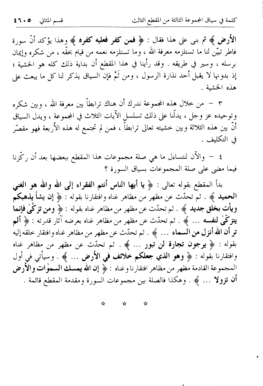 بدأ المقطع بقوله تعالى: يا أَيُّهَا النَّاسُ أَنْتُمُ الْفُقَراءُ إِلَى اللَّهِ وَاللَّهُ هُوَ الْغَنِيُّ الْحَمِيدُ. ثم تحدّث عن مظهر من مظاهر غناه وافتقارنا بقوله: إِنْ يَشَأْ يُذْهِبْكُمْ وَيَأْتِ بِخَلْقٍ جَدِيدٍ. ثم تحدّث عن مظهر من مظاهر غناه بقوله: وَمَنْ تَزَكَّى فَإِنَّما يَتَزَكَّى لِنَفْسِهِ .... ثم تحدّث عن مظهر من مظاهر غناه وافتقار خلقه إليه بقوله: يَرْجُونَ تِجارَةً لَنْ تَبُورَ .... ثم تحدّث عن مظهر من مظاهر غناه وافتقارنا بقوله: هُوَ الَّذِي جَعَلَكُمْ خَلائِفَ فِي الْأَرْضِ .... وسيأتي في أول المجموعة القادمة مظهر من مظاهر افتقارنا وغناه: إِنَّ اللَّهَ يُمْسِكُ السَّماواتِ وَالْأَرْضَ أَنْ تَزُولا .... وهكذا فالصلة بين مجموعات السورة ومقدمة المقطع قائمة.