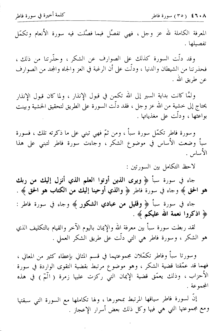 لقد ربطت سورة سبأ بين معرفة الله والإيمان باليوم الآخر والقيام بالتكليف الذي هو الشكر، وسورة فاطر هي التي دلّت على طريق الشكر العملي.