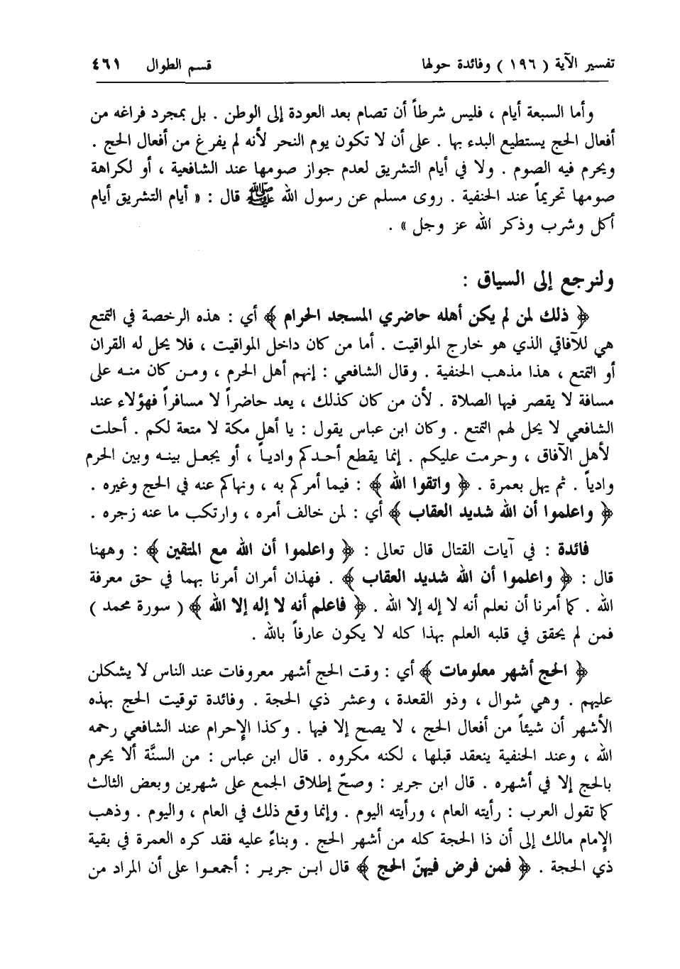 ذلِكَ لِمَنْ لَمْ يَكُنْ أَهْلُهُ حاضِرِي الْمَسْجِدِ الْحَرامِ أي: هذه الرخصة في التمتع هي للآفاقي الذي هو خارج المواقيت. أما من كان داخل المواقيت، فلا يحل له القران أو التمتع، هذا مذهب الحنفية. وقال الشافعي: إنهم أهل الحرم، ومن كان منه على مسافة لا يقصر فيها الصلاة. لأن من كان كذلك، يعد حاضرا لا مسافرا فهؤلاء عند الشافعي لا يحل لهم التمتع. وكان ابن عباس يقول: يا أهل مكة لا متعة لكم. أحلت لأهل الآفاق، وحرمت عليكم. إنما يقطع أحدكم واديا، أو يجعل بينه وبين الحرم واديا. ثم يهل بعمرة. وَاتَّقُوا اللَّهَ: فيما أمركم به، ونهاكم عنه في الحج وغيره.