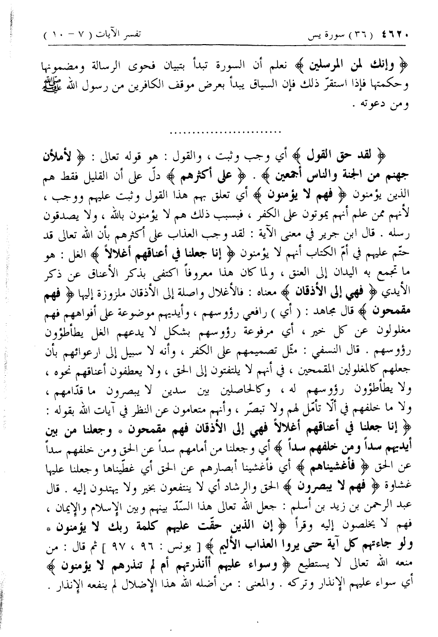إِنَّا جَعَلْنا فِي أَعْناقِهِمْ أَغْلالًا الغل: هو ما تجمع به اليدان إلى العنق، ولما كان هذا معروفا اكتفى بذكر الأعناق عن ذكر الأيدي فَهِيَ إِلَى الْأَذْقانِ معناه: فالأغلال واصلة إلى الأذقان ملزوزة إليها فَهُمْ مُقْمَحُونَ قال مجاهد: (أي) رافعي رءوسهم، وأيديهم موضوعة على أفواههم فهم مغلولون عن كل خير، أي مرفوعة رءوسهم بشكل لا يدعهم الغل يطأطئون رءوسهم. قال النسفي: مثّل تصميمهم على الكفر، وأنه لا سبيل إلى ارعوائهم بأن جعلهم كالمغلولين المقمحين، في أنهم لا يلتفتون إلى الحق، ولا يعطفون أعناقهم نحوه، ولا يطأطئون رءوسهم له، وكالحاصلين بين سدين لا يبصرون ما قدّامهم، ولا ما خلفهم في ألّا تأمّل لهم ولا تبصّر، وأنهم متعامون عن النظر في آيات الله بقوله: